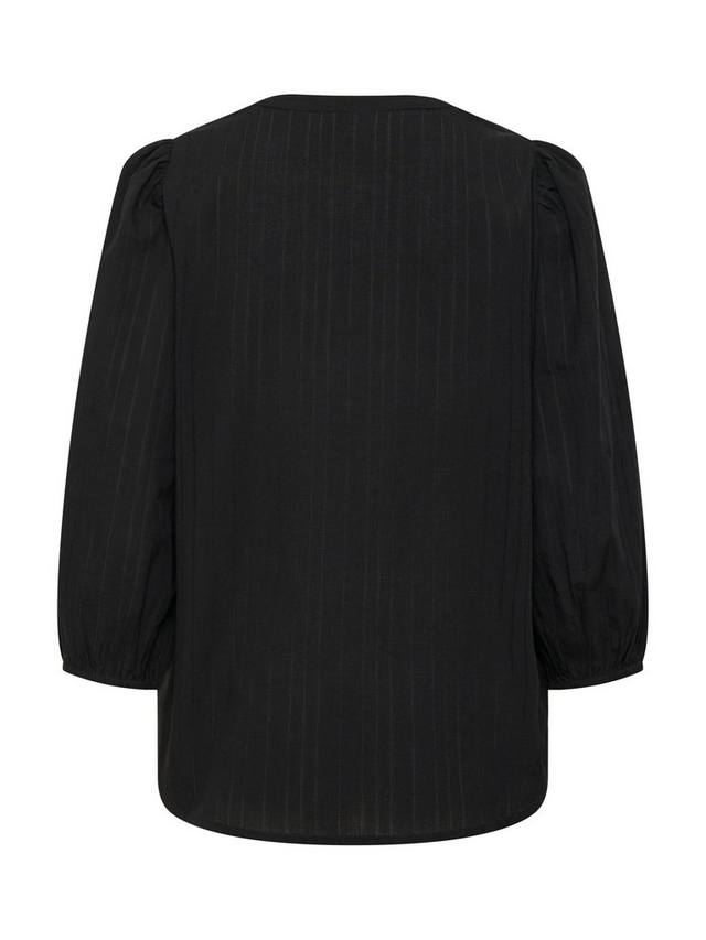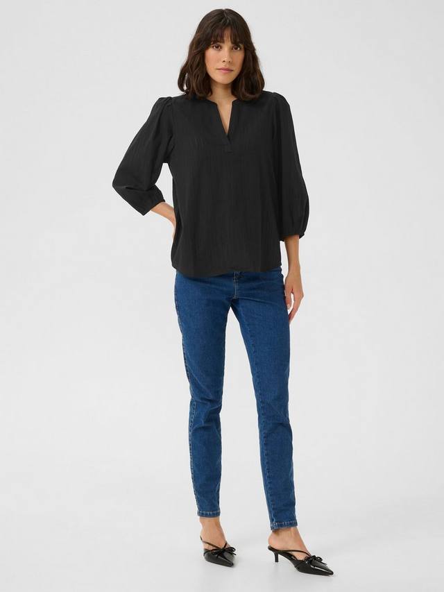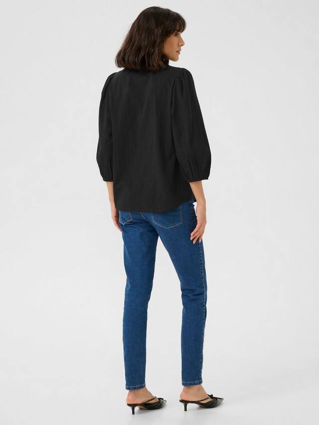 Блузка jollia - это легкий и простой повседневный топ с множеством вариантов фасона. У нее глубокий и узкий V-образный вырез с воротником-лентой, обычная посадка и закругленный низ. Рукава-баллоны длиной 3/4 собраны по эластичному краю.