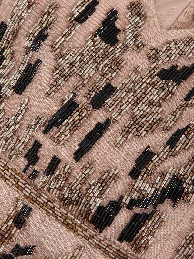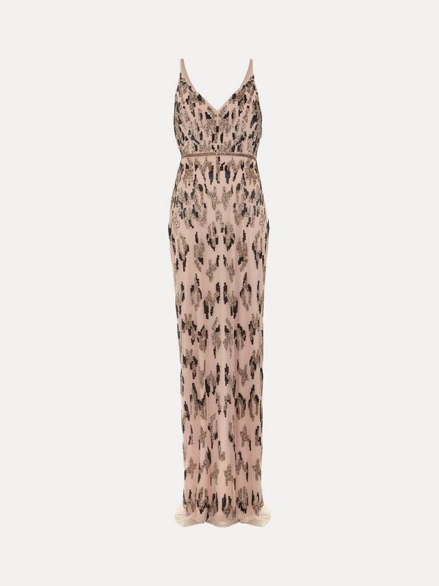 Платье Vienna украшено бисером, создающим абстрактный леопардовый принт, который всегда будет в тренде. Этот фасон, переходящий в силуэт макси для придания эффектности, дополнен разрезом сзади для придания дополнительного очарования.