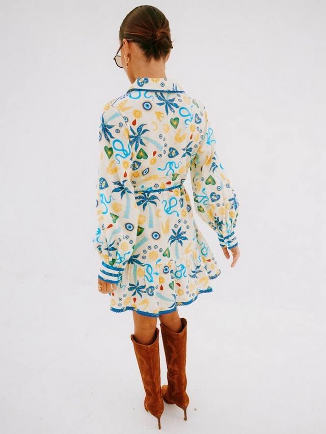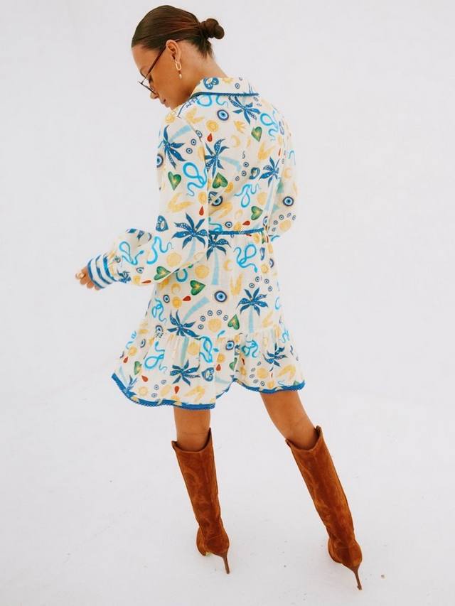 Классическое платье, на которое можно положиться снова и снова, облегающее бедра от Never Fully Dressed выполнено из легкого, воздушного льна. Элегантный фасон с вырезом-воротником и рукавами полной длины украшен абстрактным принтом.