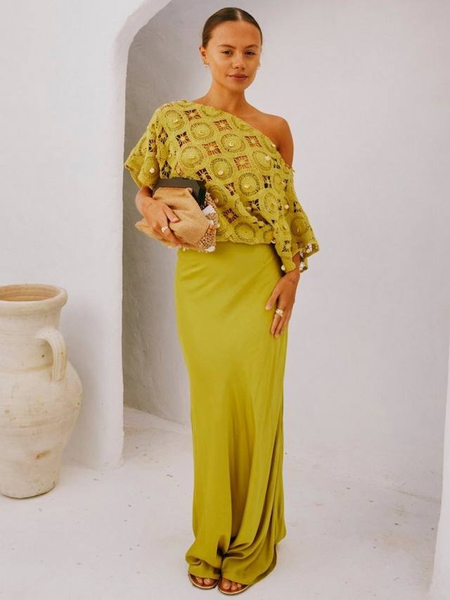 Платье из смесовой ткани - легкий топ, связанный крючком, сочетается с атласной юбкой, создавая прекрасный свободный струящийся силуэт.