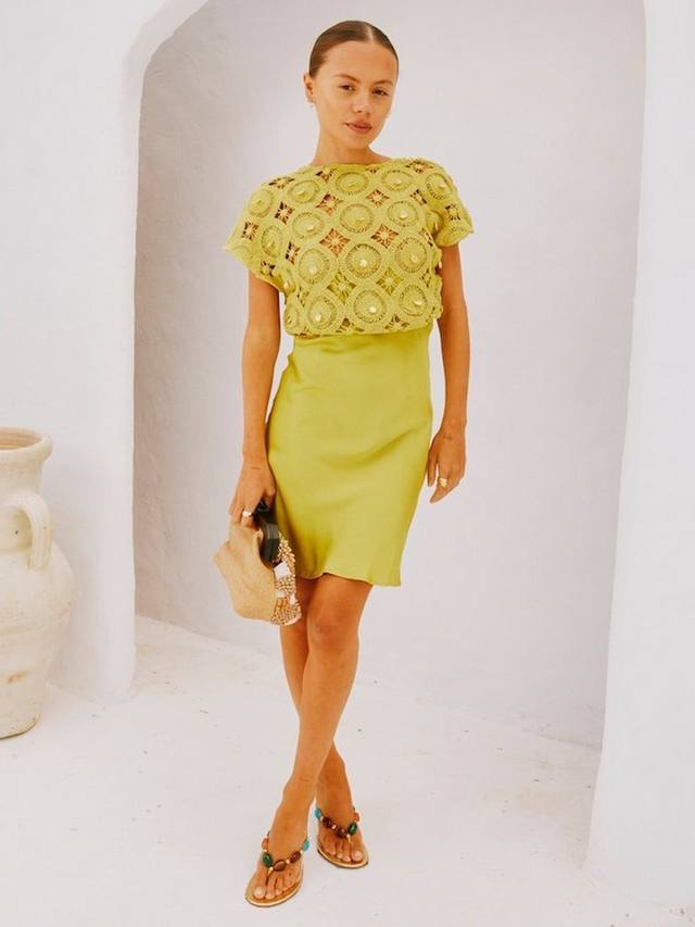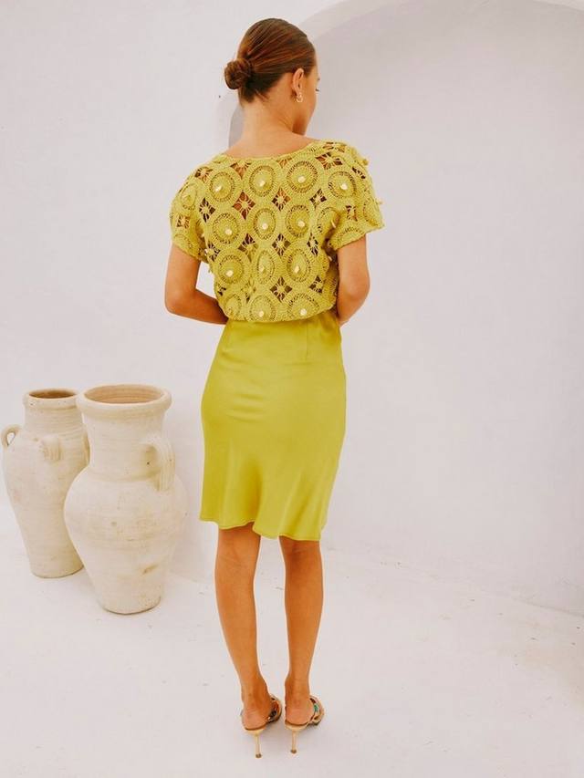 Платье из смесовой ткани - легкий топ, связанный крючком, сочетается с атласной юбкой, создавая прекрасный свободный струящийся силуэт.