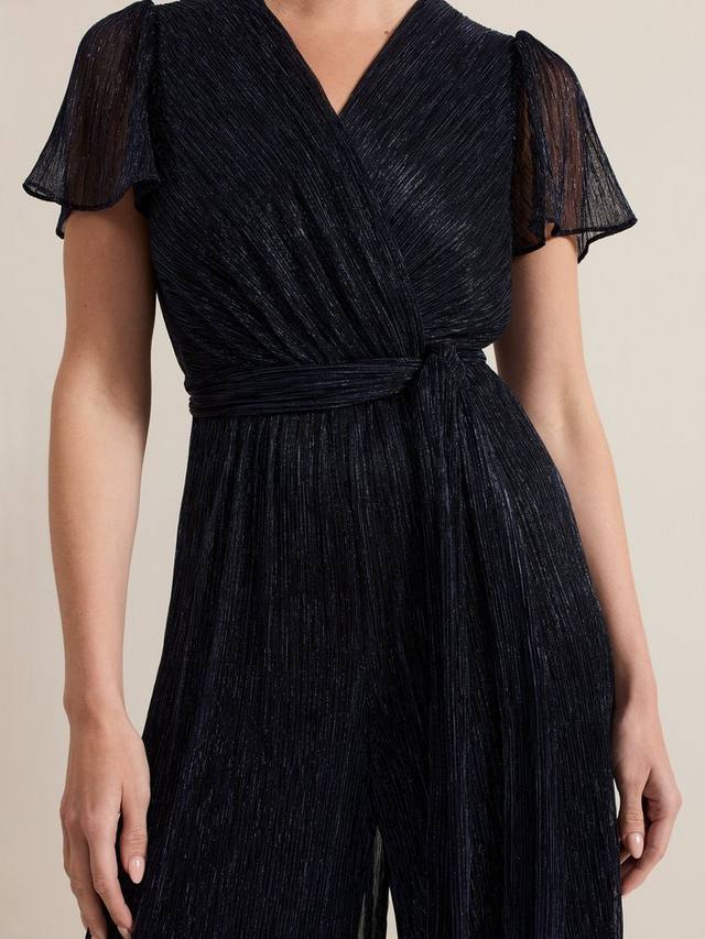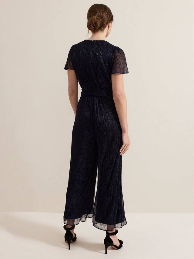 Комбинезон Stella классического оттенка с отделкой металлическими нитями, женственным V-образным вырезом, лифом с искусственным запахом и плиссированным материалом по всей длине, создающим красивые движения. Свободный завязывающийся пояс подчеркивает талию и ниспадает на широкие брюки, создавая идеальный стиль для мероприятия.