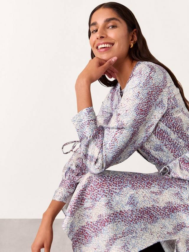 Это миди-платье от Whistles прямого силуэта с разрезами по бокам на подоле выполнено из жидкой вискозы. Закругленный вырез и рукава полной длины с завязками на манжетах дополняют этот фасон животным принтом в виде пятнистой змеи.