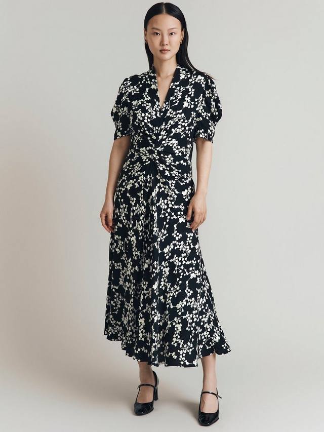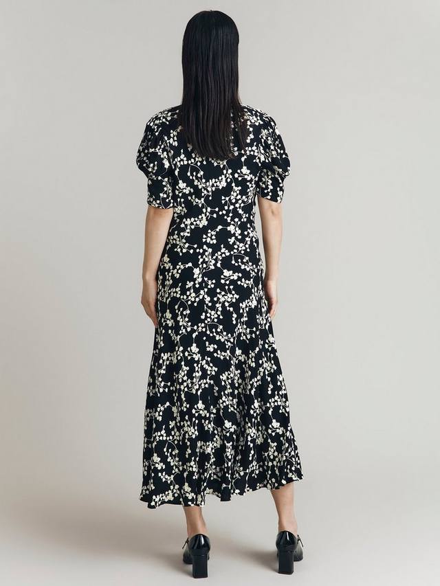 Это платье миди от Ghost, выполненное в стиле А-силуэта, полном движения и шуршания, из жидкого атласа. Модель с v-образным вырезом и короткими рукавами украшена пышным цветочным принтом, который контрастирует с черной основой.