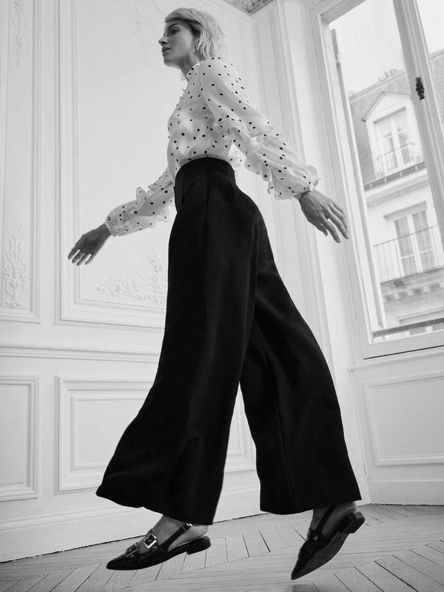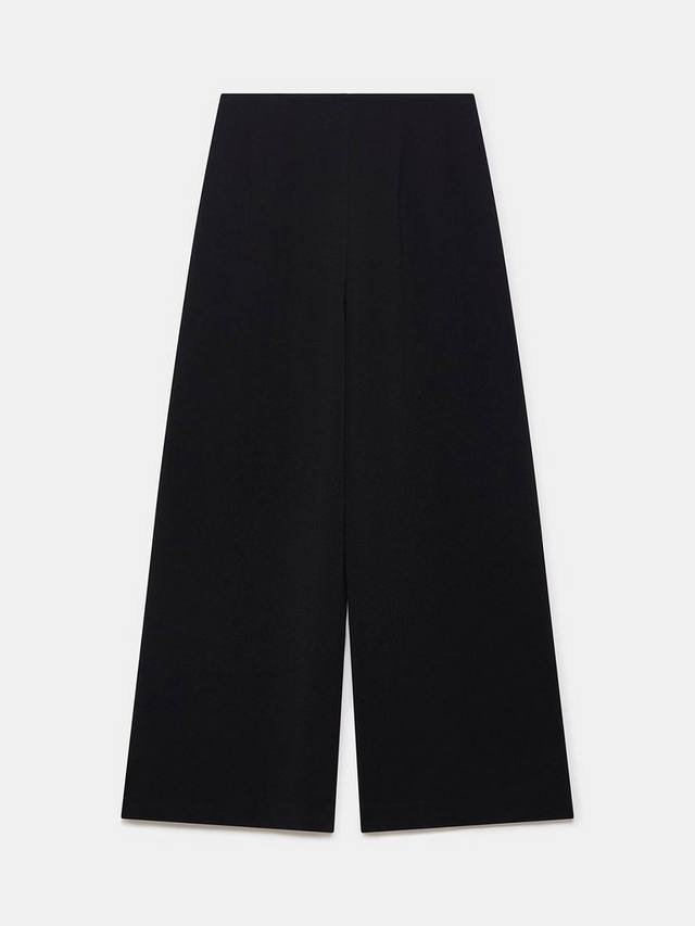 Элегантная пара широких брюк силуэта с высокой талией, разрезом спереди и потайной ширинкой на молнии с застежкой на крючок.