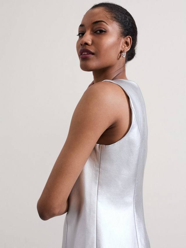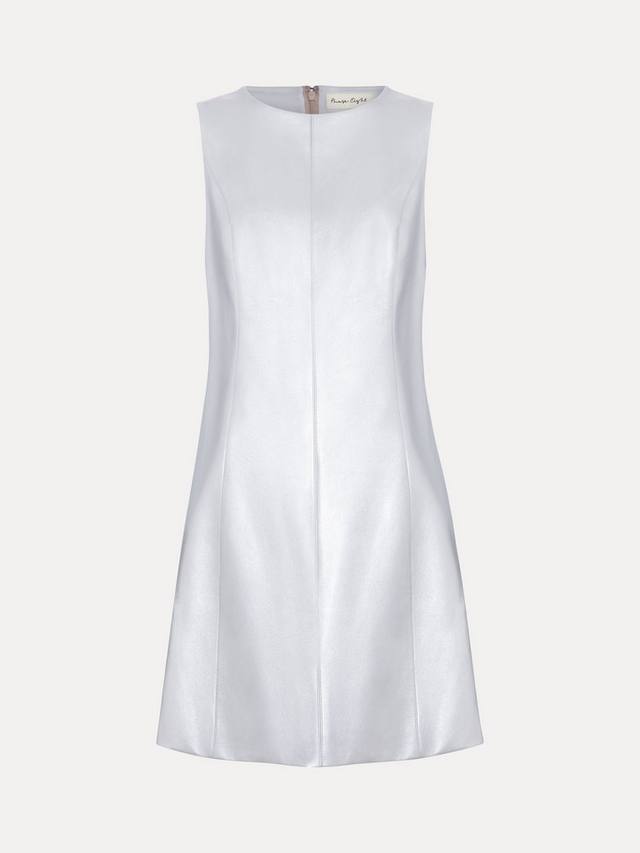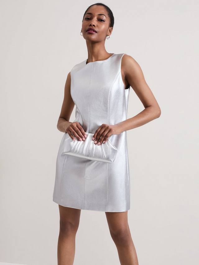 Модное платье Ellora цвета металлик с круглым вырезом и структурированными передними швами, без рукавов, создающее современный женственный стиль. Мы сочетаем наше платье с серебристыми аксессуарами в тон для эффектного образа.