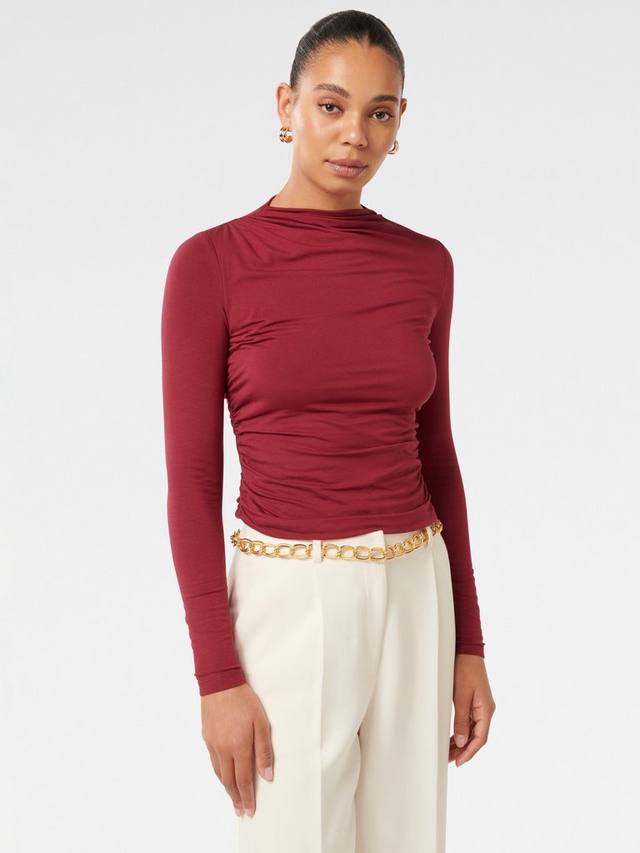 Этот трикотажный топ с высоким воротом от Forever New приталенного покроя с привлекательными рюшами - не обычный для вас.