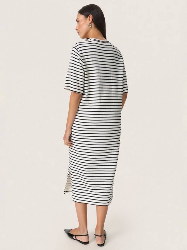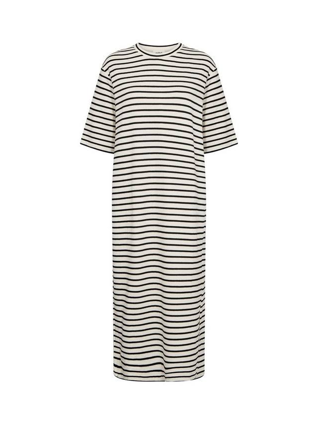 Миди-платье Ingina - это повседневное платье-футболка из мягкого и эластичного джерси в полоску. У него круглый вырез, свободный крой и длина ниже икр. Рукава половинной длины с широкой посадкой, а платье имеет низкий разрез.