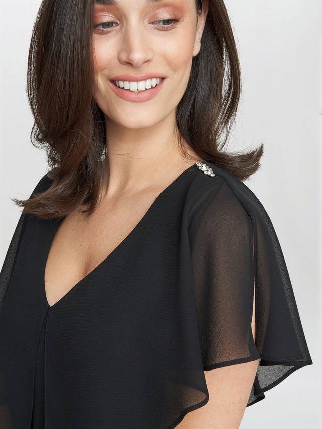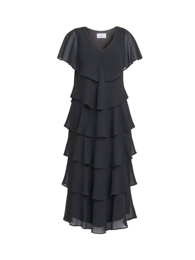 Это платье средней длины от Gina Bacconi с множеством многоуровневых слоев сшито из легкой и удобной ткани. Благодаря универсально привлекательному v-образному вырезу и коротким рукавам этот фасон лишен ненужных украшений.