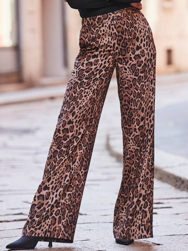 Трендовые брюки удобного, но шикарного силуэта с широкими штанинами. Сшиты из мягкой и драпирующейся ткани, высоко сидят на талии, создавая эффектную посадку. Леопардовый принт нейтрален - они подойдут ко всему, например, к трикотажу и кортам для 9-5, сексуальному топу и туфлям на каблуках для ночных прогулок.