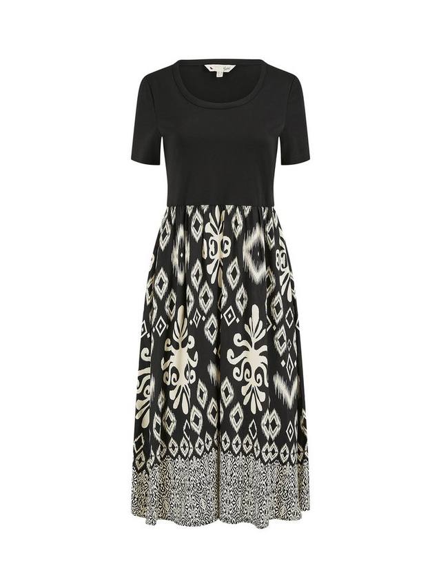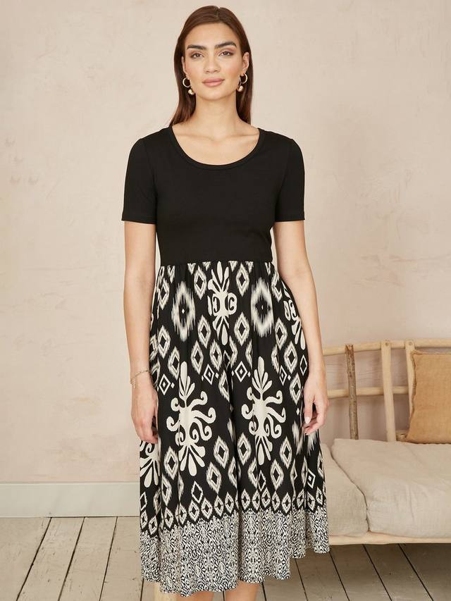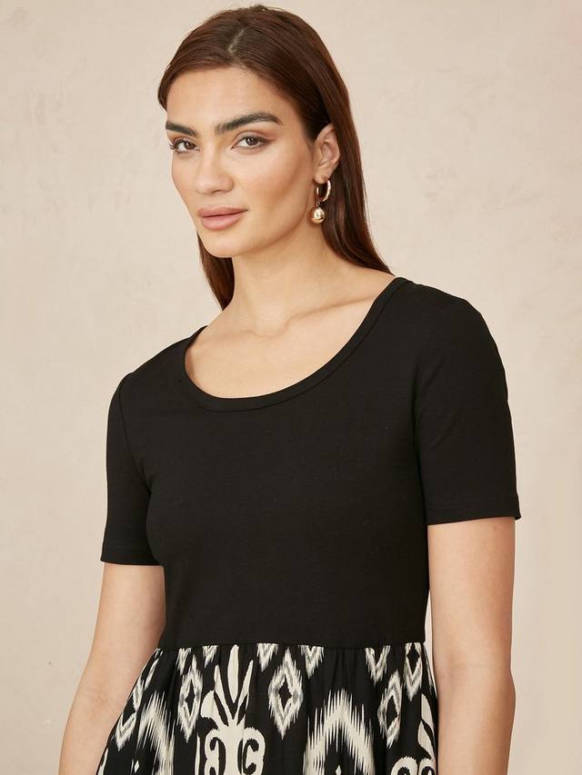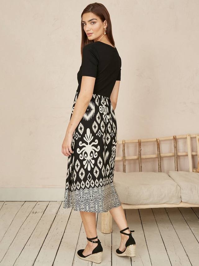 Функциональность и мода - отличное сочетание, и это платье миди идеально подходит и для того, и для другого. С топом-футболкой из хлопкового джерси и юбкой с принтом это платье потрясающе смотрится как сверху, так и снизу.