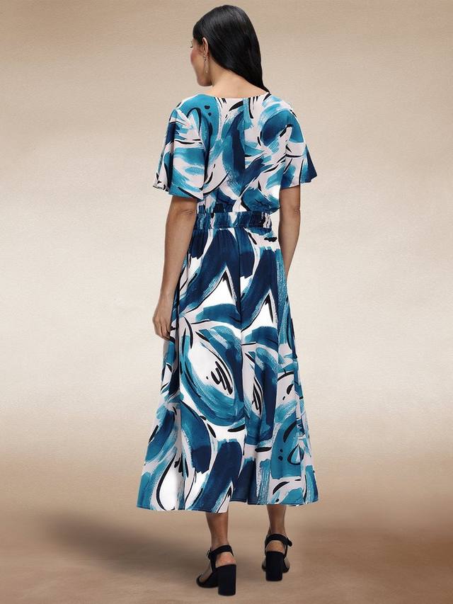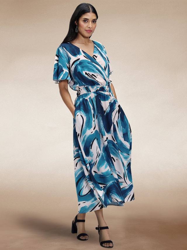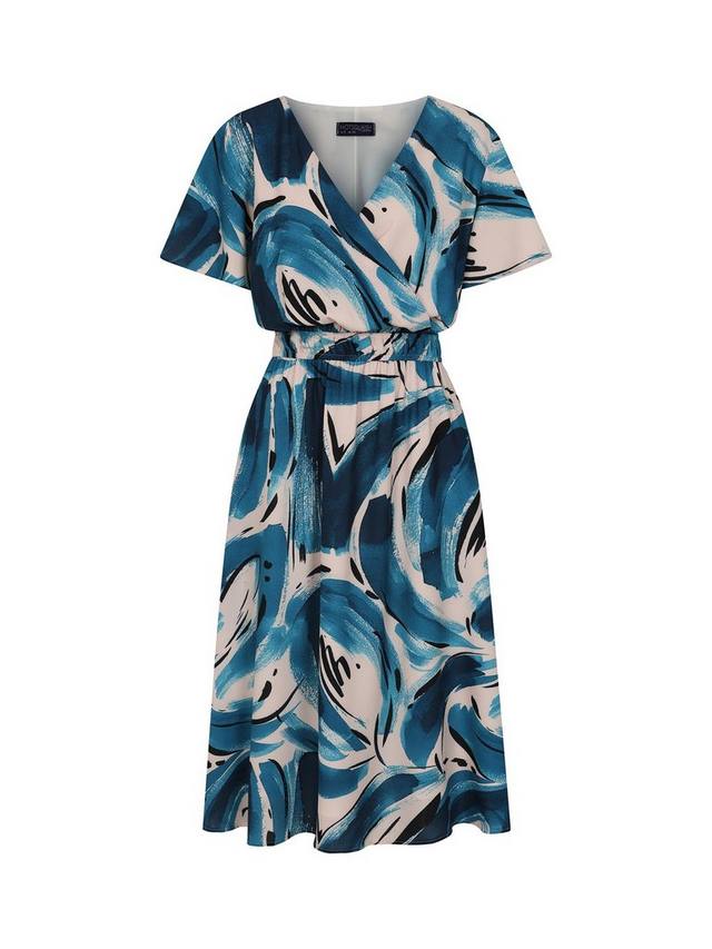 Легкое в носке миди-платье А-силуэта с расклешенным подолом от HotSquash из мягкой шифоновой ткани с эластичным поясом, который стягивает фигуру, благодаря чему юбка элегантно ниспадает до икр. Этот непринужденный фасон с имитацией обертки на вырезе и короткими рукавами воплощен в жизнь абстрактным принтом.