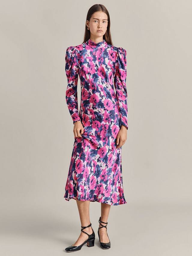 Это платье средней длины от Ghost, выполненное в стиле легкого халата, сшито из вискозы, которую любят за ее невесомость. Лаконично вырезанное, с высоким вырезом и длинными рукавами, оно украшено вечно желанными цветами.
