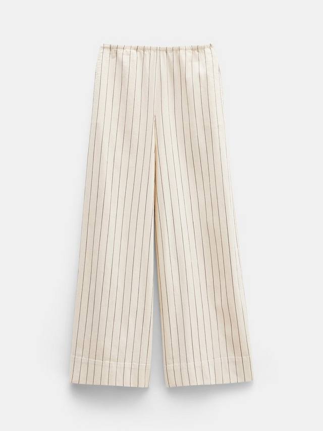 В нашей книге отлично сидящие широкие брюки являются неотъемлемой частью гардероба. Возьмем, к примеру, Элисию. Тонкие полоски притягивают взгляд книзу, создавая эффект удлинения, а эластичный пояс делает их действительно удобными. Что касается цвета? Белоснежный делает их идеальными для лета и не только.