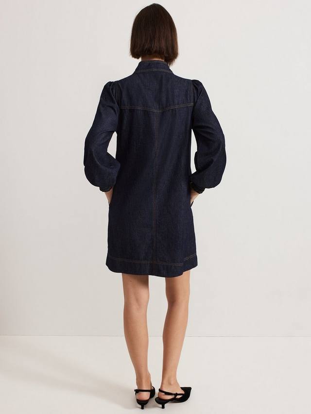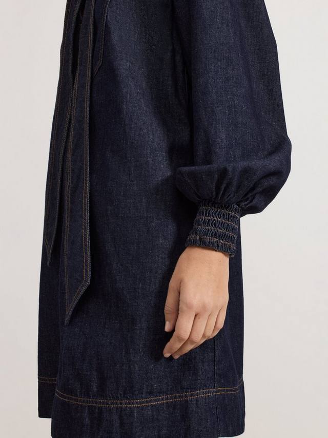 Это мини-платье А-силуэта от Phase Eight, являющееся альтернативой обычным джинсовым фасонам, выполнено из чистого хлопкового денима. Этот фасон с выразительным вырезом-завязкой и рукавами полной длины с гофрированными эластичными манжетами дополнен идеально расположенными накладными карманами спереди.