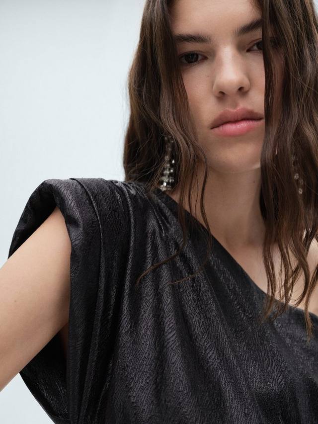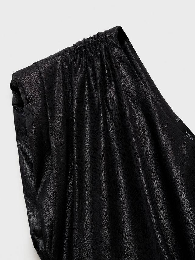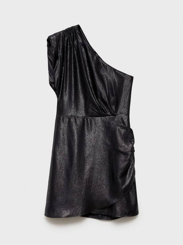 Облегающее фигуру платье от Mango, облегающее бедра, благодаря металлизированной ткани идеально подходит для вечеринок. С асимметричным вырезом с рюшами и юбкой с запахом, дополненной такими же блестящими аксессуарами.