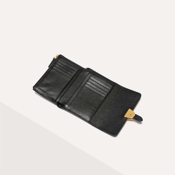 Средний кошелек Зерновая кожа Металлические детали в форме медиатора Застежка на кнопку Внутренний кошелек для монет на молнии Кошелек для монет на молнии сзади Держатель для десяти карт Держатель для купюр с разделителем Четыре внутренних клина Защита RFID Позолота Логотип на аксессуаре Размеры: 14x10 см - 160 г