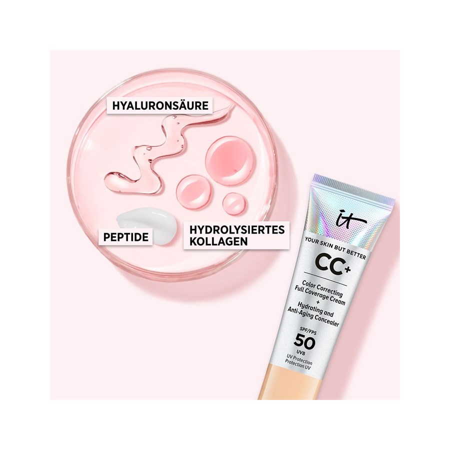 Крем Your Skin But Better CC+ SPF 50+ от it Cosmetics впечатляет своими универсальными свойствами: он сочетает в себе увлажняющий уход с тональным кремом и защитой от солнца. Его богатая формула содержит ниацин, пептиды, водоросли, витамины А, С, В и Е, гидролизованный коллаген и гиалуроновую кислоту. Интенсивно увлажняет кожу и придает ей сияющую свежесть. Благодаря высокому солнцезащитному фактору 50 обеспечивает оптимальную защиту от УФ-А и УФ-В излучения. Благодаря своей высокопигментированной формуле он мгновенно скрывает темные круги и недостатки, не забиваясь в мелкие морщинки и не осыпаясь. Противодействует признакам старения кожи, разглаживая ее текстуру и уменьшая глубину морщин.