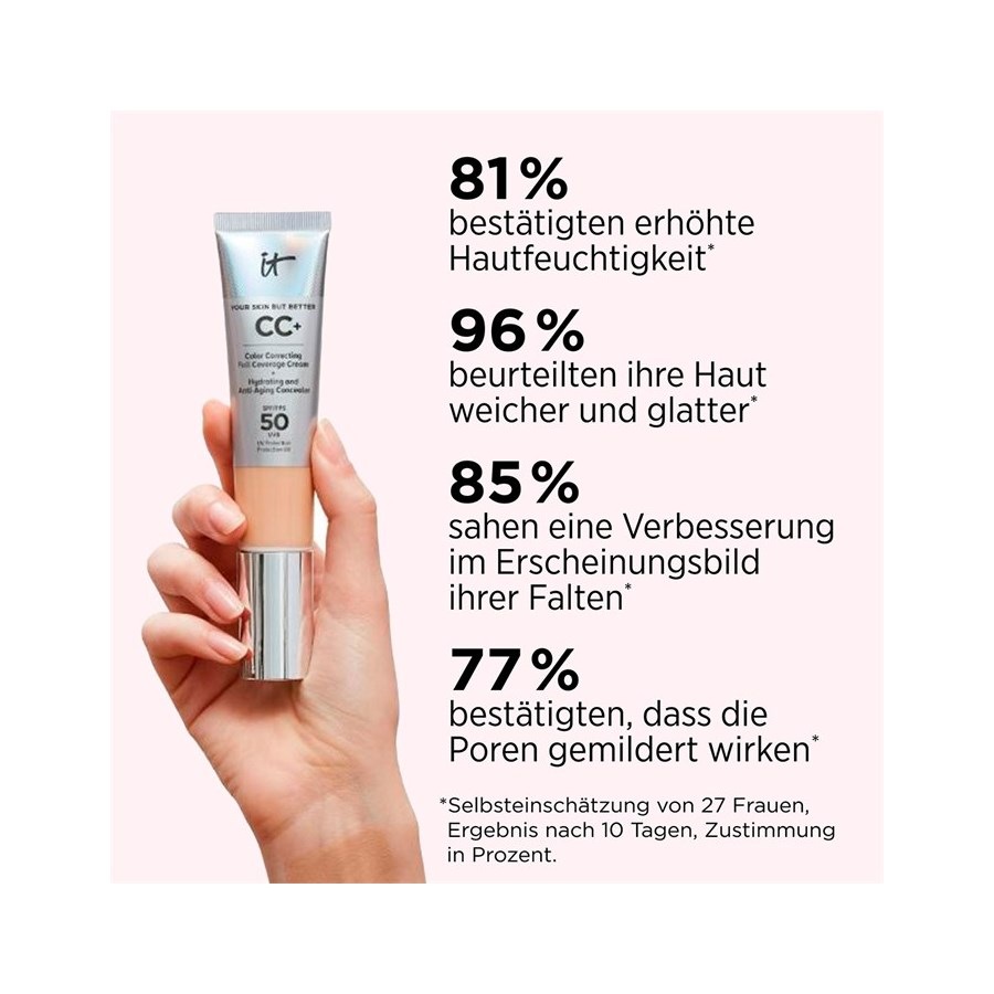 Крем Your Skin But Better CC+ SPF 50+ от it Cosmetics впечатляет своими универсальными свойствами: он сочетает в себе увлажняющий уход с тональным кремом и защитой от солнца. Его богатая формула содержит ниацин, пептиды, водоросли, витамины А, С, В и Е, гидролизованный коллаген и гиалуроновую кислоту. Интенсивно увлажняет кожу и придает ей сияющую свежесть. Благодаря высокому солнцезащитному фактору 50 обеспечивает оптимальную защиту от УФ-А и УФ-В излучения. Благодаря своей высокопигментированной формуле он мгновенно скрывает темные круги и недостатки, не забиваясь в мелкие морщинки и не осыпаясь. Противодействует признакам старения кожи, разглаживая ее текстуру и уменьшая глубину морщин.