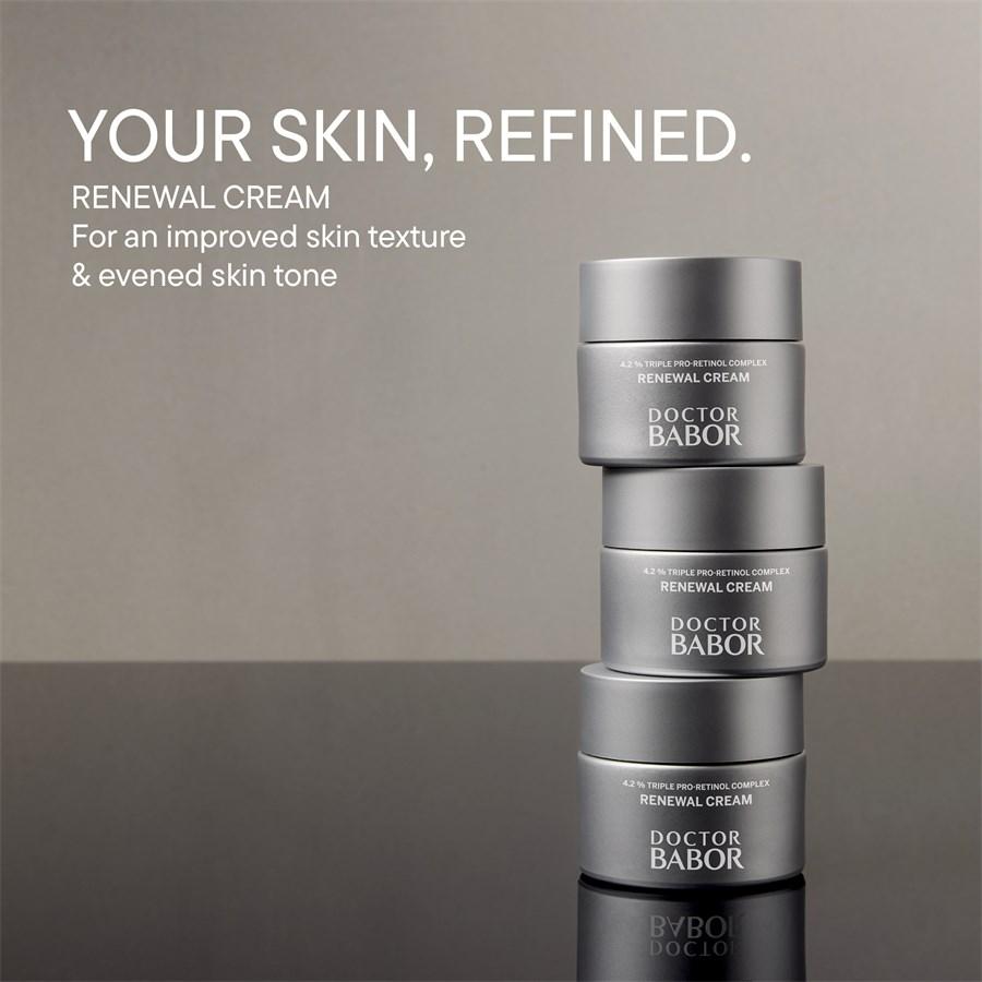 Крем BABOR Renewal из коллекции Doctor BABOR — это интенсивное средство для антивозрастного ухода за кожей, которое дарит вам более гладкую и сияющую кожу. Содержит тройной активный комплекс проретинола и другие мощные ингредиенты, которые оказывают положительное влияние на процессы обновления кожи. Сочетание ретинола пальмитата и стабильно инкапсулированного ретинола стимулирует выработку собственного коллагена организмом и улучшает эластичность и упругость кожи. В состав средства по уходу за кожей также входит бакучиол — растительный аналог ретинола. Этот антиоксидантный активный ингредиент способствует регенерации кожи и защищает ее от вредных внешних воздействий. Вместе с ретинолом бакучиол также противодействует старению кожи. Формула также содержит комбинацию ниацинамидов, аминокислот и витамина Е. Эти ингредиенты повышают устойчивость кожи к стрессу, ежедневному износу и воздействию окружающей среды.