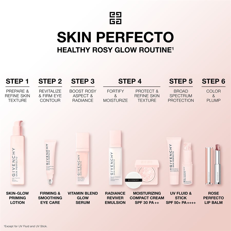 Он поместится в любую сумочку и всегда будет под рукой, когда вы в пути. Средство по уходу за кожей набирается пуховкой и наносится на лицо. Благодаря своим ингредиентам он придает лицу розовый, мерцающий цвет, придавая ему здоровый и свежий вид. Для улучшения баланса влажности кожи компактный крем SKIN PERFECTO содержит большое количество глицерина. Это вещество доказало свою эффективность в уходе за кожей, поскольку оно помогает коже удерживать воду в клетках. В неблагоприятных условиях окружающей среды, таких как холод, ветер или сухой воздух, глицерин помогает предотвратить потерю влаги. Благодаря этому кожа остается эластичной и гладкой, даже если внешние условия далеки от идеальных. Для дальнейшего стимулирования регенерации дермы компания GIVENCHY обогатила компактный крем SKIN PERFECTO экстрактом грейпфрута. В сочетании с экстрактом семян бразильского перечного дерева средство для ухода за кожей мягко стимулирует кровообращение, благодаря чему клетки лучше снабжаются питательными веществами. Это стимулирует клеточный метаболизм и обеспечивает сияющий внешний вид.