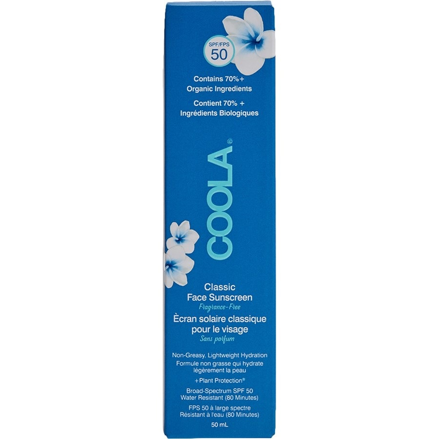 Ищете эффективное средство защиты от УФ-излучения? Солнцезащитные средства Coola отличаются натуральными ингредиентами и инновационными технологиями. Солнцезащитный крем Coola's Classic Face Sunscreen SPF 50 без отдушек — это высококачественное органическое солнцезащитное средство для лица. Благодаря этому уходу вы защищены от ультрафиолетового излучения и одновременно противодействуете преждевременному старению кожи, вызванному светом. Солнцезащитный крем Classic Face SPF 50 Fragrance Free содержит инновационную формулу Face(R). Эта формула представляет собой солнцезащитный крем, увлажняющее средство и защиту широкого спектра от UVA/UVB-излучения в одном средстве. Средство особенно подходит для людей, страдающих аллергией, и людей с чувствительной кожей, поскольку не содержит отдушек. Текстура очень легкая, сливается с кожей и поэтому идеально подходит под макияж.