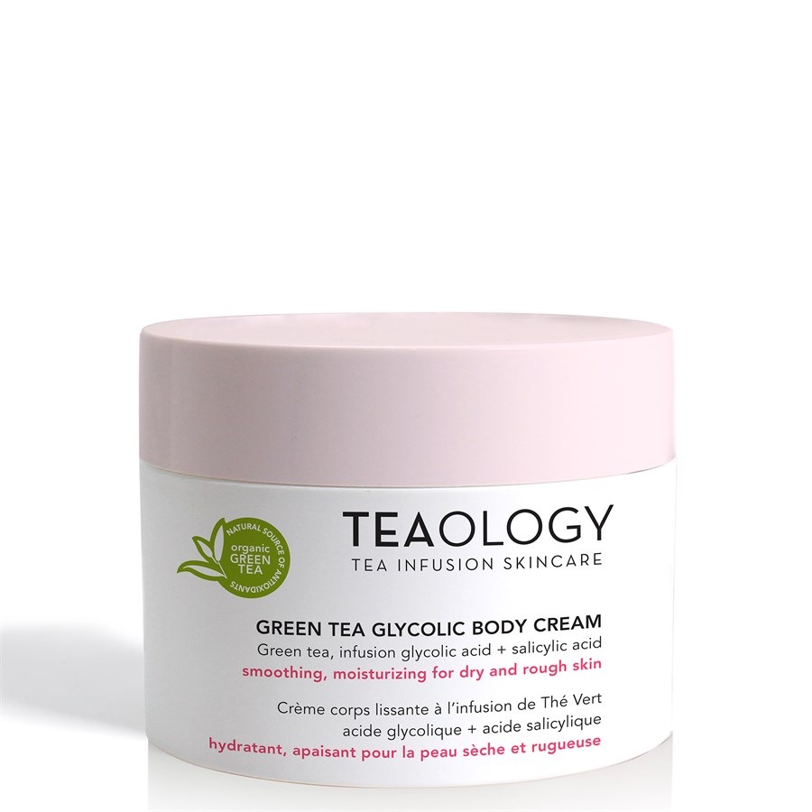 Крем для тела Green Tea Glycolic от Teaology с настоем зеленого чая, гликолевой кислоты и салициловой кислоты оказывает разглаживающее, увлажняющее действие на сухую и грубую кожу.