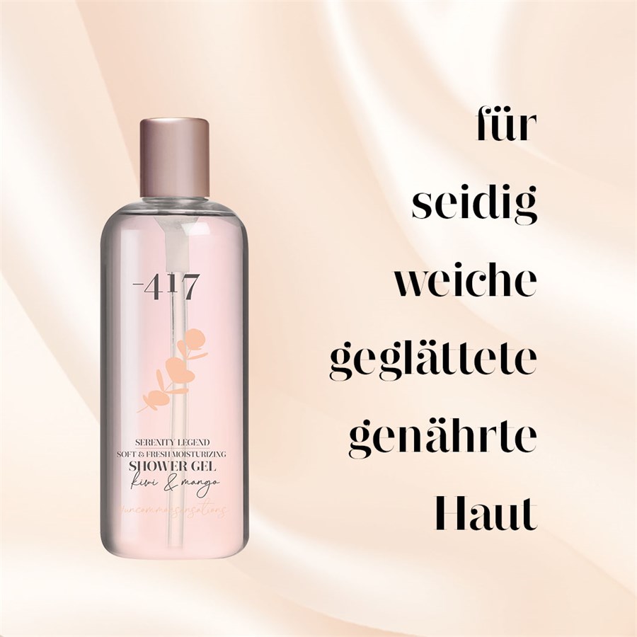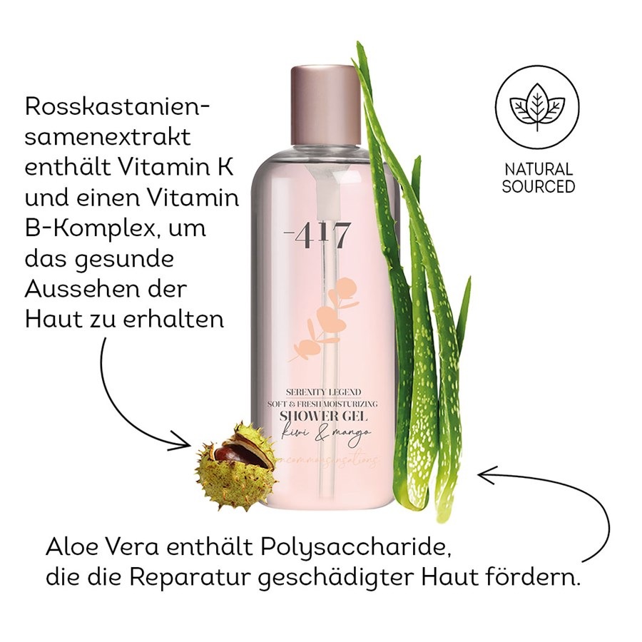 The -417 Kiwi & Манго Мягкий & Освежающий увлажняющий гель для душа из серии Serenity Legend поражает своим антиоксидантным действием. Это не только очищает кожу от грязи и остатков пищи, но и от токсинов, которые накапливаются в течение дня. Кроме того, очищающее средство для кожи оказывает питательное, укрепляющее и ухаживающее действие, а также придает коже фруктовый аромат киви и манго. Гель для душа создан на основе высокоэнергетической воды Мертвого моря, которая увлажняет кожу. Обогащенное маслом виноградных косточек и экстрактами цветков ромашки, зеленого чая, алоэ вера и конского каштана, очищающее средство для кожи оказывает успокаивающее и заживляющее действие, а также стимулирует кровообращение в коже. Гель для душа также богат витаминами A, B, E и F. Вместе они улучшают удержание влаги в коже, стимулируют производство клеток кожи, уменьшают количество свободных радикалов и защищают от солнечных лучей.