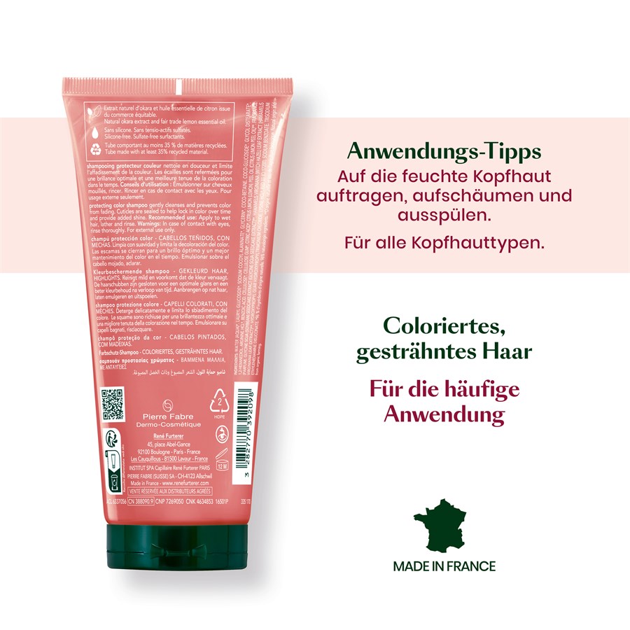 Шампунь для защиты цвета René Furterer Color Glow защищает окрашенные волосы — при каждом мытье головы. Согласно исследованиям производителя, щадящее очищающее средство по уходу за волосами способно сохранять цвет до десяти недель. 96% активных ингредиентов имеют натуральное происхождение и биоразлагаемы. Шампунь для защиты цвета волос René Furterer Color Glow также поставляется в устойчивой экоупаковке. Средство по уходу за волосами не содержит сульфатов и силиконов, а также во время мытья волос переносит в волосы и кожу головы питательные органические аминокислоты окары. Они оказывают действие, подобное кератину, и, следовательно, укрепляющее действие.