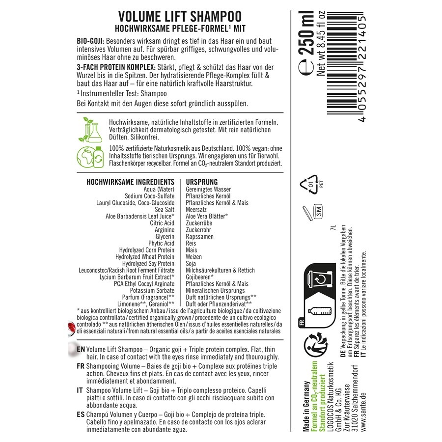 Sante Naturkosmetik — это бренд в косметическом секторе, который в равной степени выступает за устойчивый уход и разнообразие продукции. Шампунь Volume Lift — это