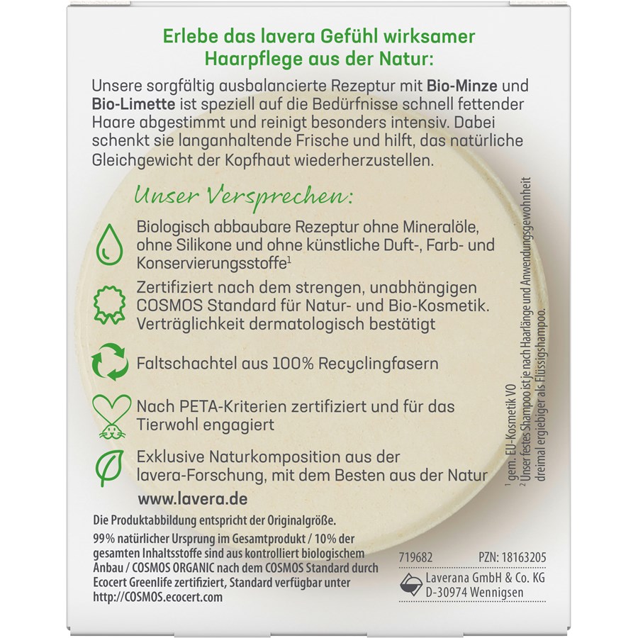 Ваш твердый шампунь для ухода Fresh & Balance by Lavera подходит для бережного ухода за быстро жирными волосами. В состав веганского средства по уходу за волосами входят отборные ингредиенты высокого органического качества. Органическая мята и органический лайм тщательно очищают волосы и дарят им длительное ощущение свежести. Отборные растительные масла и масло какао обеспечивают легкость расчесывания волос после мытья. Как и вся продукция Lavera, твердый шампунь не содержит силиконов, минеральных масел, синтетических отдушек, красителей и консервантов. Использовать его просто: вспеньте мыло под проточной водой, аккуратно помассируйте влажные волосы, затем тщательно смойте. Дайте шампуню высохнуть на воздухе после использования.