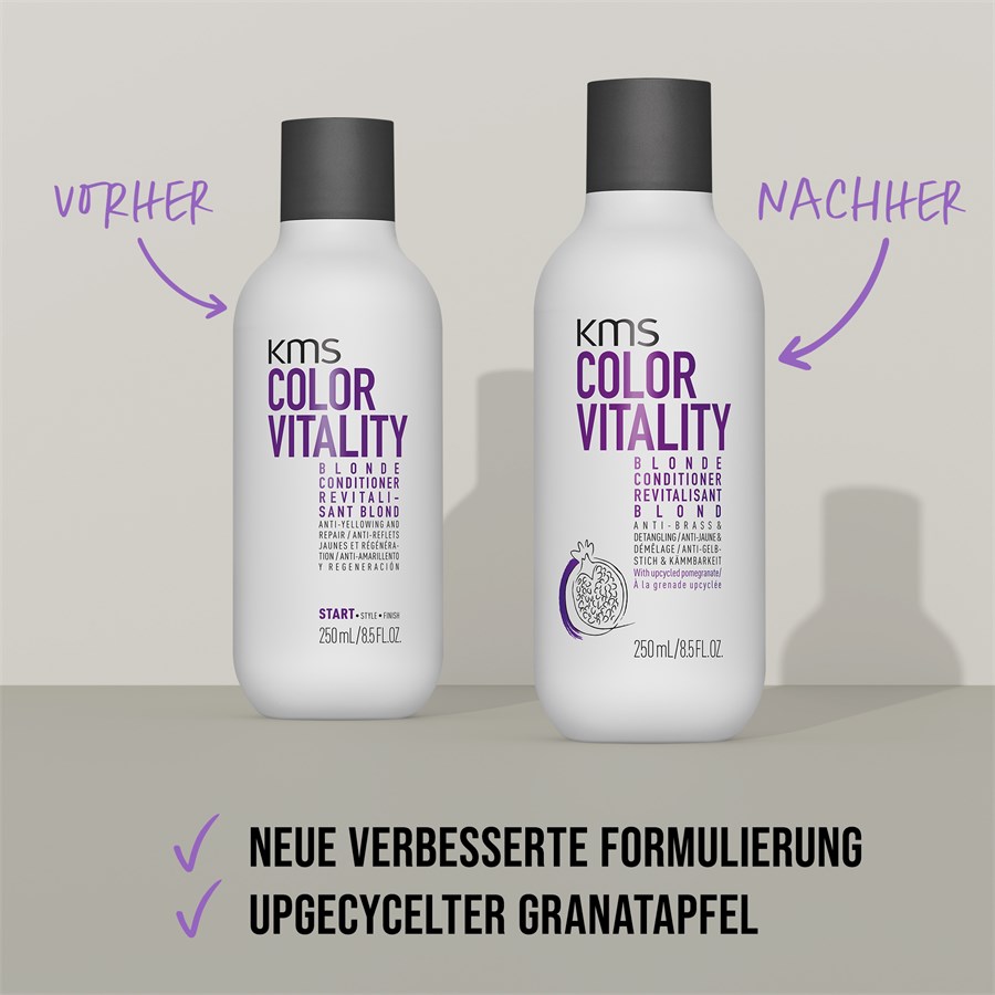 С кондиционером для блондинок KMS Colorvitality из серии для окрашенных волос вы можете заставить ваши волосы исчезнуть с надоедливой желтизны и вернуть вашему блонду блеск — уже после первого использования. Уход за волосами дополняет действие шампуня Colorvitality Blonde и может использоваться на обесцвеченных, мелированных, натуральных светлых, а также седых и белых волосах. В то же время кондиционер Blonde, подходящий для всех типов волос, обеспечивает интенсивное увлажнение, не утяжеляя волосы. Комплекс AHA Structure также восстанавливает внутреннюю структуру волоса, поверхность волос становится заметно мягче и легче расчесывается. Синий прямой краситель отвечает за нейтрализацию желтых тонов.