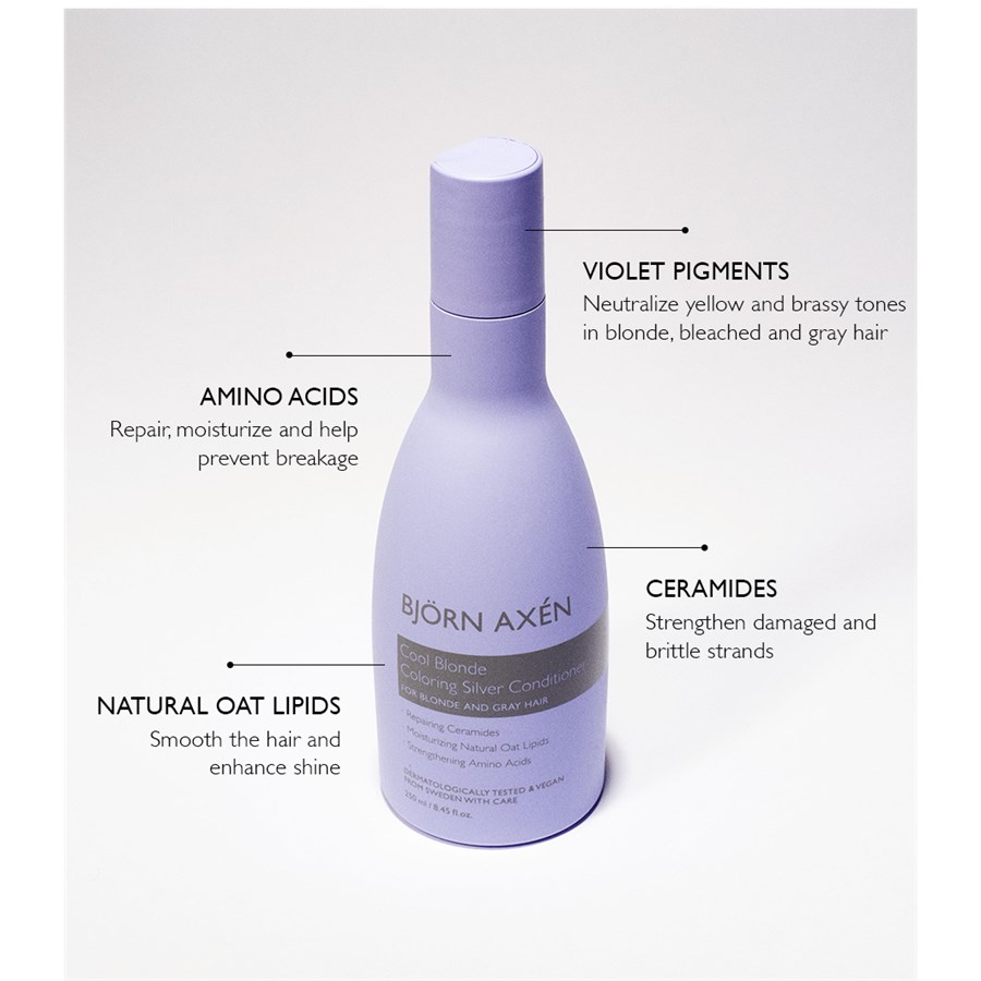 Первоклассный продукт от Björn Axén — это кондиционер Coloring Silver из серии Cool Blonde. Можно с уверенностью сказать, что это новшество в уходе за волосами — настоящая революция. Кондиционер Björn Axén Coloring Silver делает волосы невероятно сильными и в то же время особенно гладкими. Продукт не содержит микропластика, силиконов и т. д. и чрезвычайно эффективен в борьбе с желтизной светлых волос. Это стало возможным благодаря сине-фиолетовым красящим пигментам, содержащимся в кондиционере Cool Blonde, в сочетании с высококачественными ухаживающими компонентами. Пшеничный протеин, витамин Е и другие ценные ингредиенты делают это средство по уходу за волосами по-настоящему необходимым. Когда дело доходит до нейтрализации желтизны и медных оттенков, вряд ли найдется лучшее решение, чем кондиционер Coloring Silver от Björn Axén. Приложение невероятно простое в использовании. Нанесите небольшое количество средства на ладони и вотрите в волосы. Примерно через одну-две минуты кондиционер можно смыть большим количеством теплой воды. Даже тонкие волосы после использования сияют новым блеском и становятся невероятно объемными и чрезвычайно послушными. Кроме того, этот уход за волосами Cool Blonde гарантирует, что ваши волосы будет гораздо легче укладывать. Прекрасное чувство!