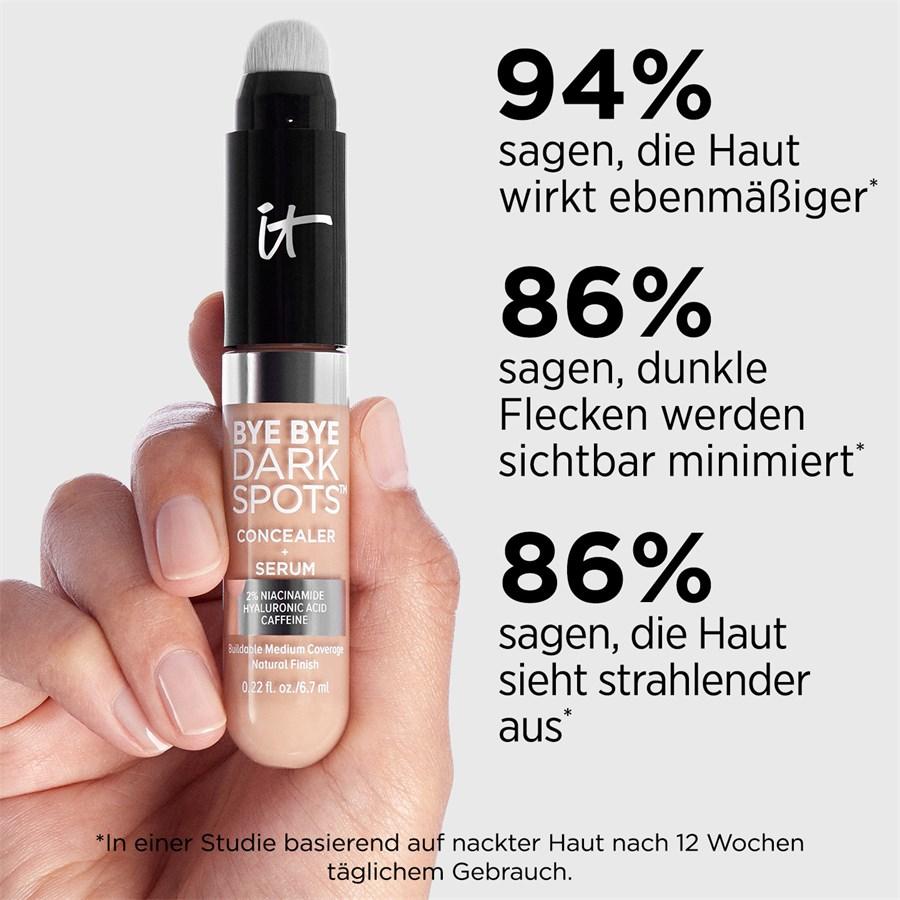С нетерпением ждем мягкий сывороточный консилер от It Cosmetics, который едва заметен благодаря своей удивительно легкой текстуре. Осыпающийся, сухой макияж остался в прошлом. Консилер Bye Bye Dark Spots Concealer обеспечивает до 24 часов увлажнения и комфортного ношения. Покрытие среднее, но его можно увеличить при многократном использовании. С другой стороны, при желании можно получить и удивительно естественную отделку. Наносите средство в качестве основы под макияж на все лицо или точечно на темные пятна и другие недостатки. При регулярном использовании продукт может также оказать положительное воздействие на вашу кожу, так что в будущем необходимость в консилере отпадет. Формула консилера Bye Bye Dark Spots Concealer содержит ниацинамид, кофеин и гиалуроновую кислоту.