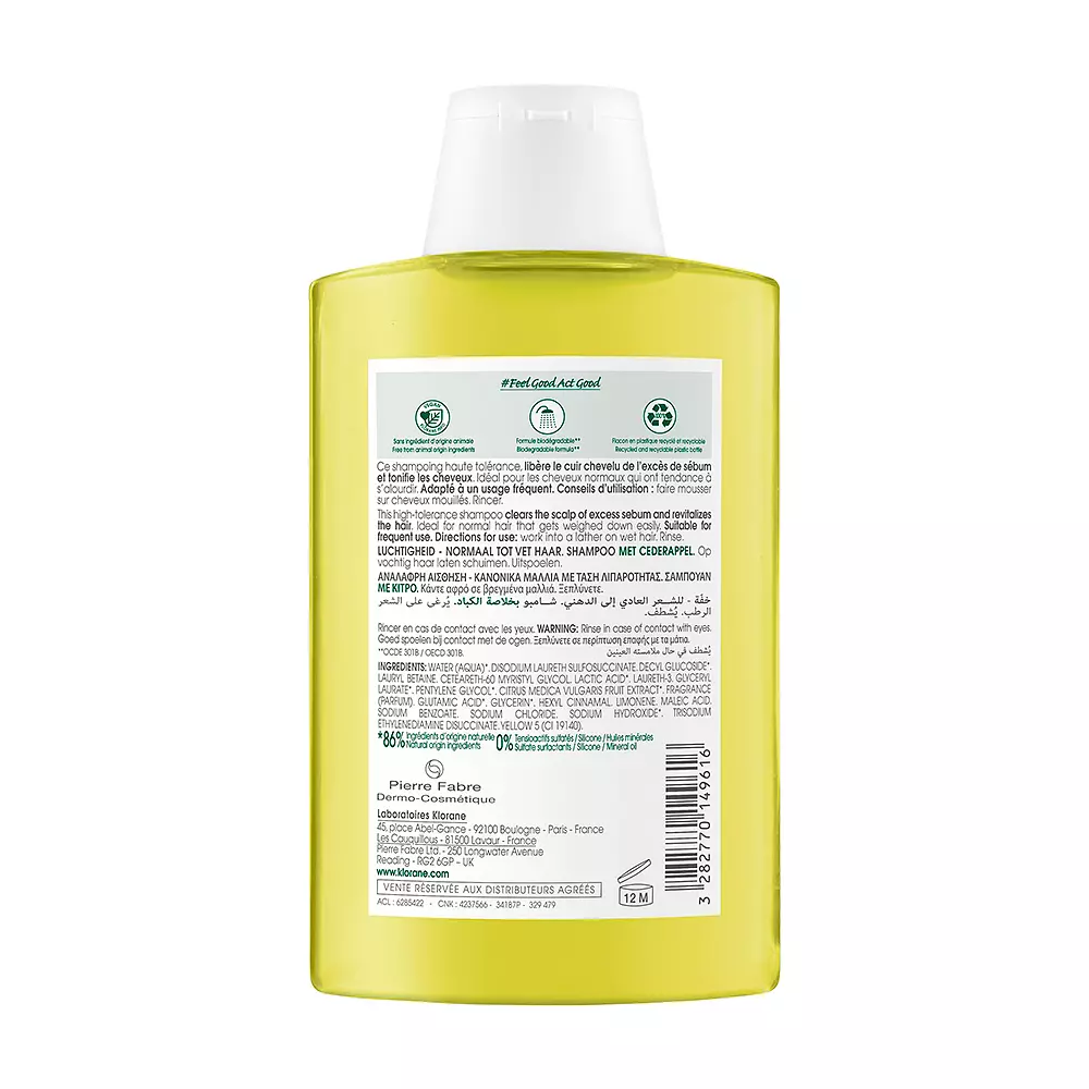 Компания Klorane разработала очищающий и восстанавливающий шампунь Citron, отвечающий потребностям нормальных волос, которые быстро становятся жирными. Через несколько дней волосы становятся тусклыми и безжизненными. Во время мытья наш шампунь с мякотью цитрона очищает и восстанавливает кожу головы, эффективно удаляя известковый налет и загрязнения. Эта уникальная формула содержит активный ингредиент, регулирующий выработку кожного сала, — мякоть цитрона, цитрусового фрукта, выращенного под корсиканским солнцем, — который надолго сохраняет волосы чистыми и дарит коже головы более здоровый вид. Полный энергии, более чистый и легкий*, жирные волосы дольше остаются под контролем**, а волосы становятся более сияющими.