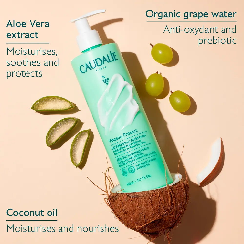 Для лица и тела восстанавливающее молочко Vinosun Protect After-Sun Repair питает, восстанавливает и успокаивает раздраженную кожу после пребывания на солнце, а также продлевает загар на 2 недели.