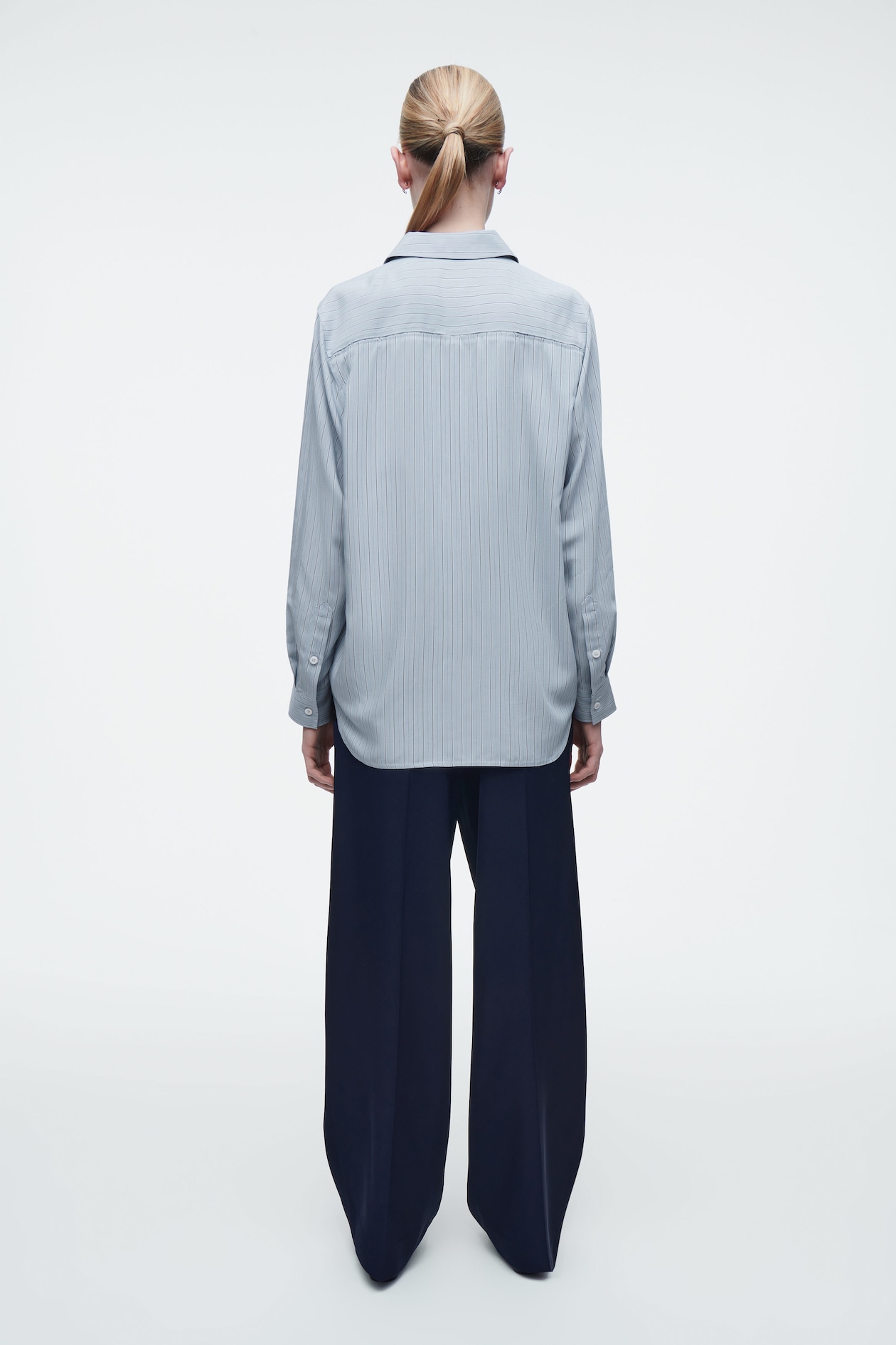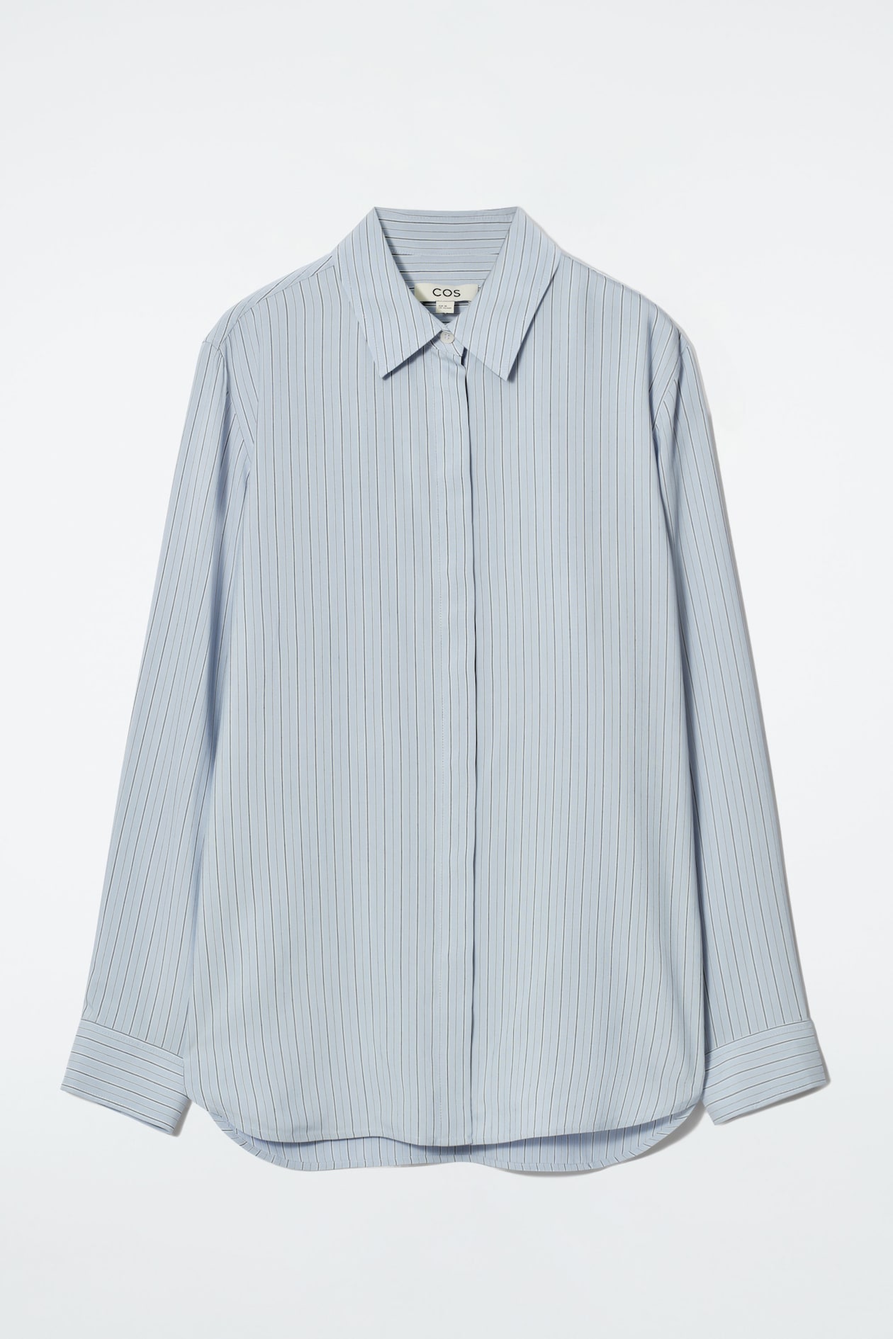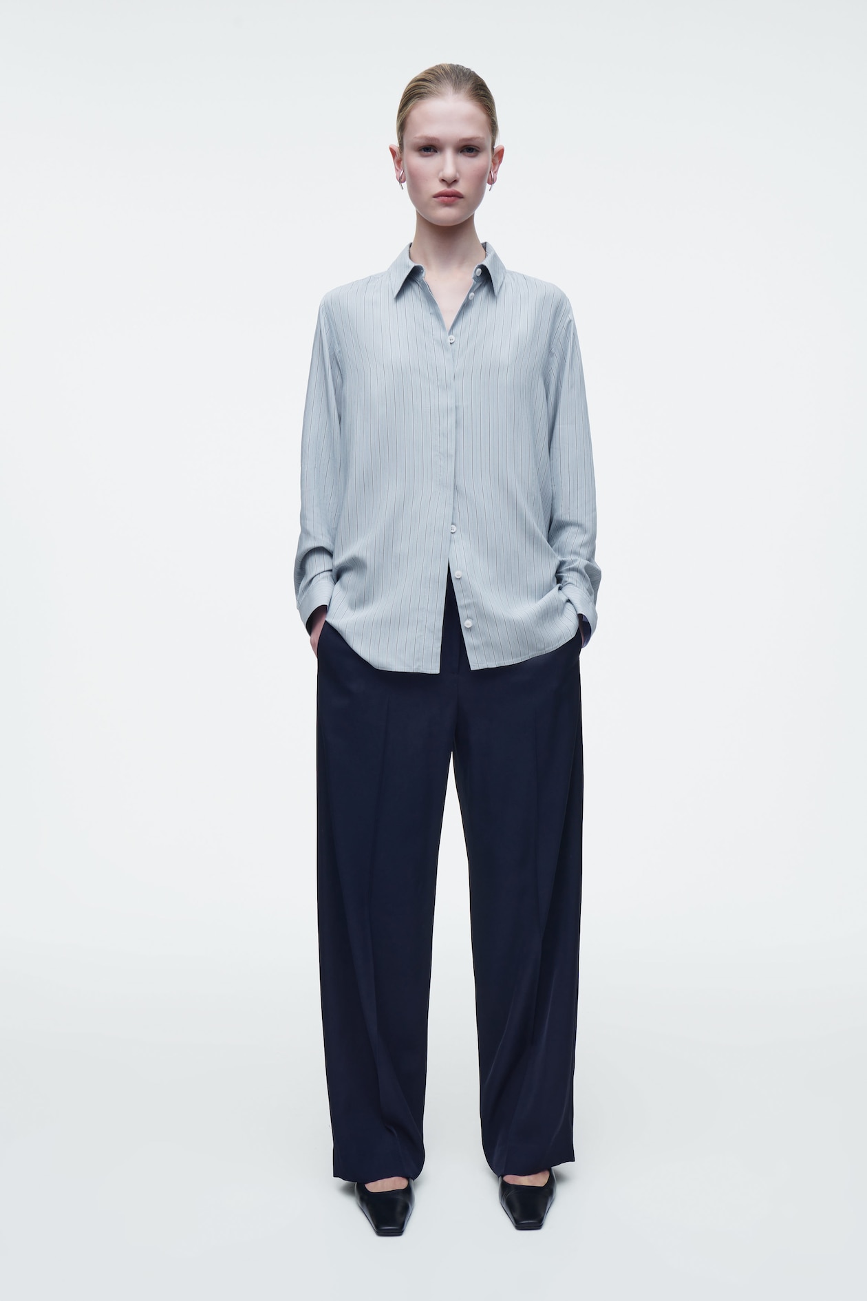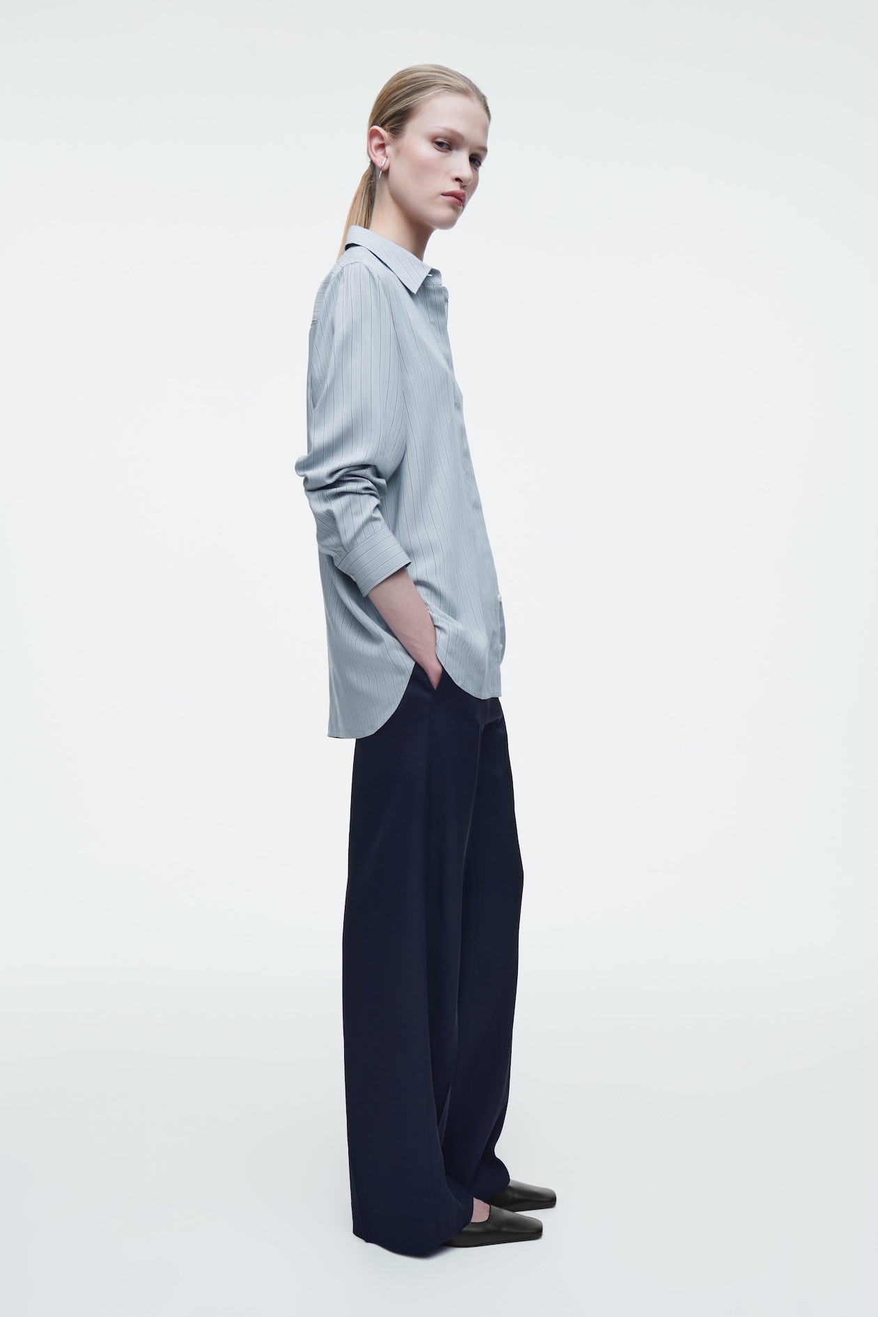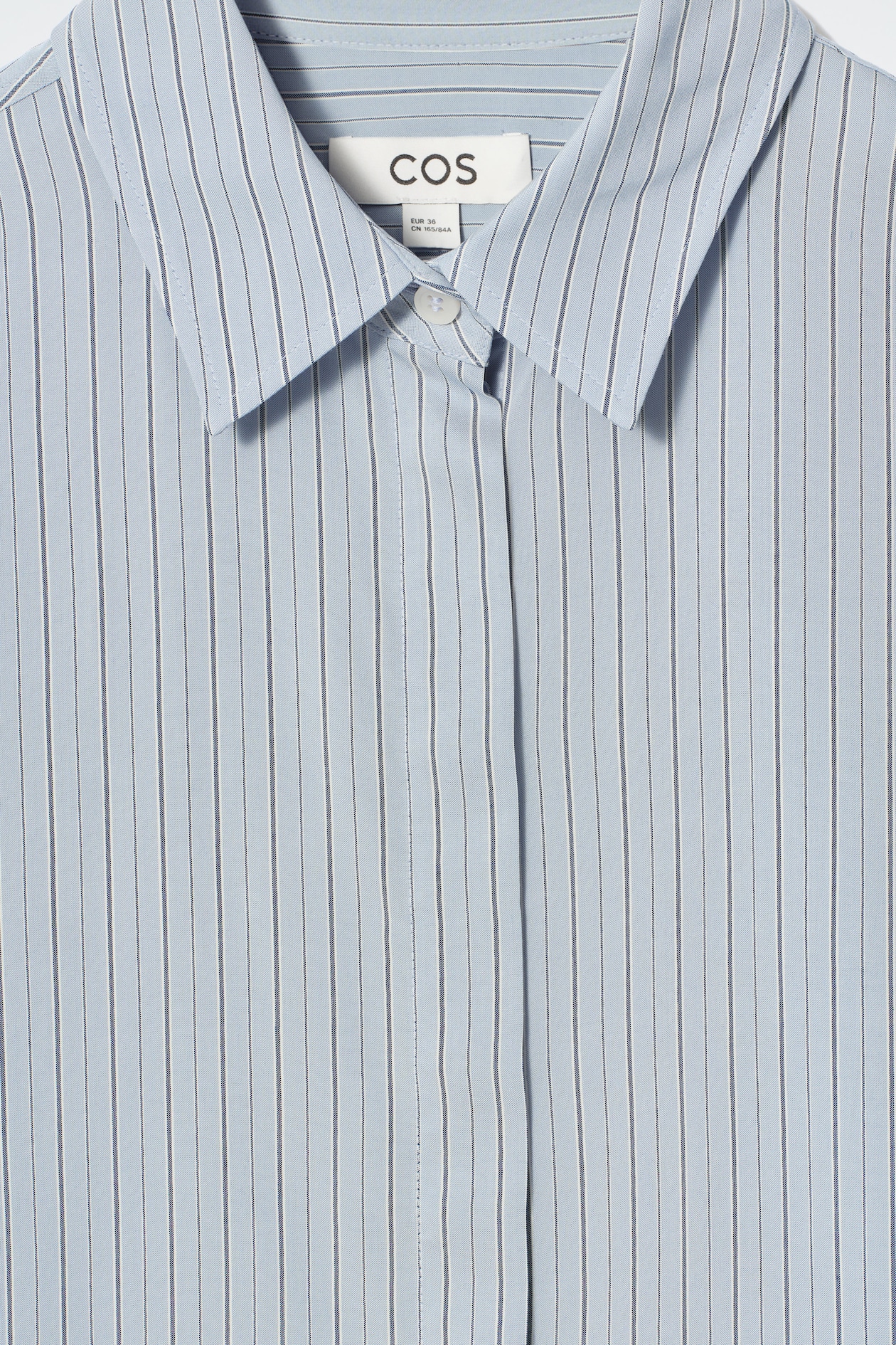 Мы представляем современную версию рубашки, вдохновленную мужскими фасонами. Модель выполнена из смесовой вискозы ECOVERO, а ее дизайн включает в себя полосы слегка контрастных цветов, классический воротник, манжеты на пуговицах и диагональный шов сзади.