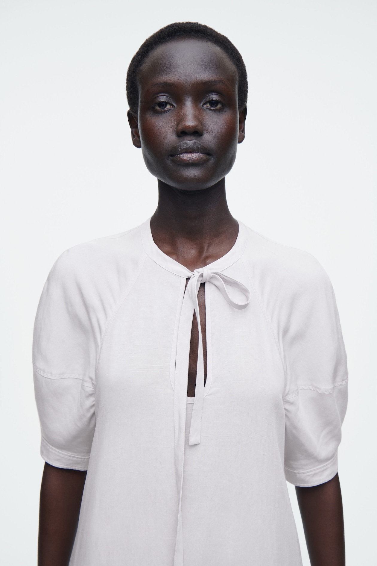 Представляем воздушное платье миди из смеси льна и лиоцелла TENCEL, которое разнообразит ваш весенний гардероб. Модель отличается завязывающимся воротником, большими пышными рукавами и поясом, который тонко подчеркивает талию. Дополнить образ рекомендуем балетками.