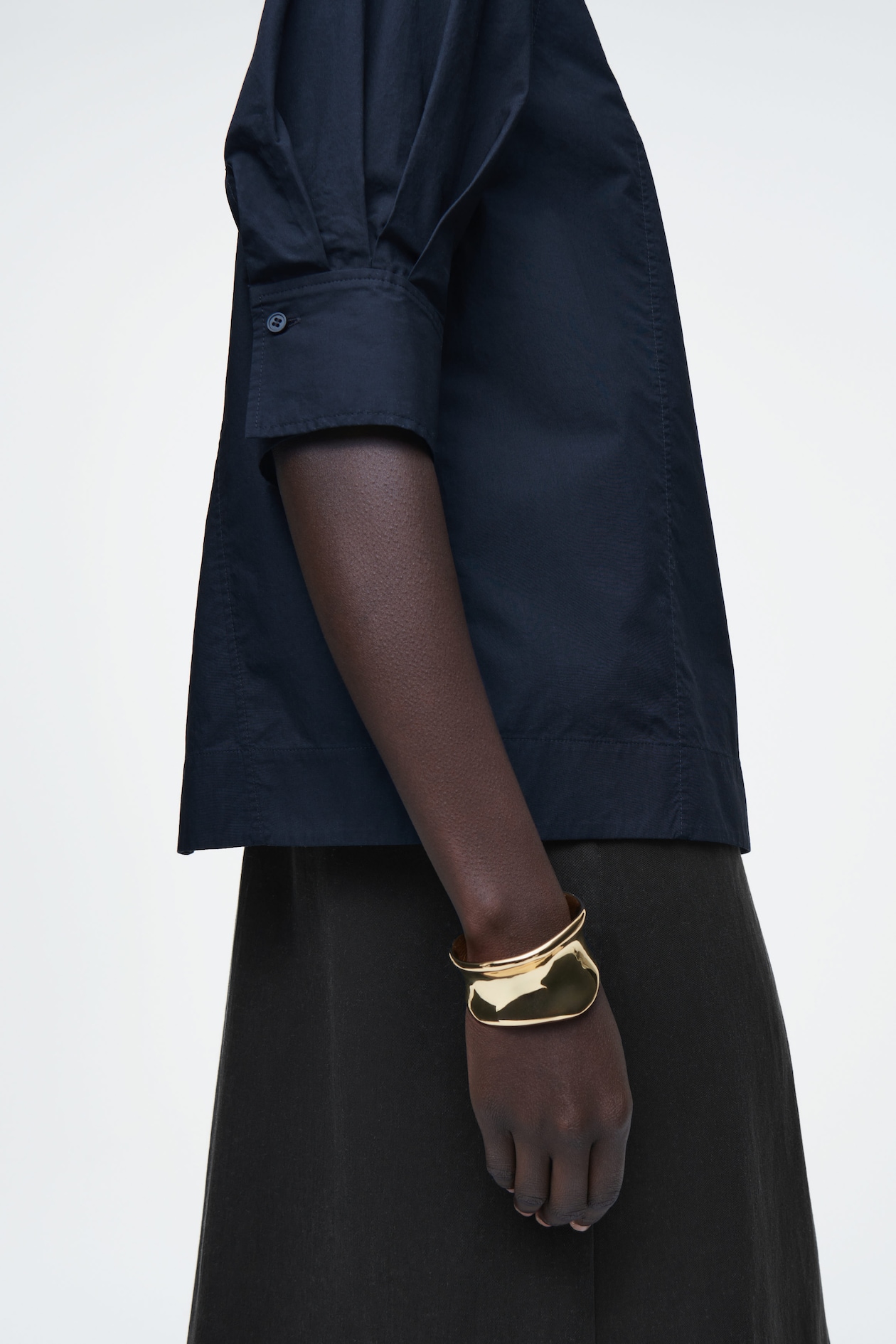 Эта изысканная блузка объемного кроя выполнена из качественного хлопка приглушенного темно-синего тона. Она имеет вырез-лодочку, рукава-буфы реглан и изогнутый подол А-силуэта.