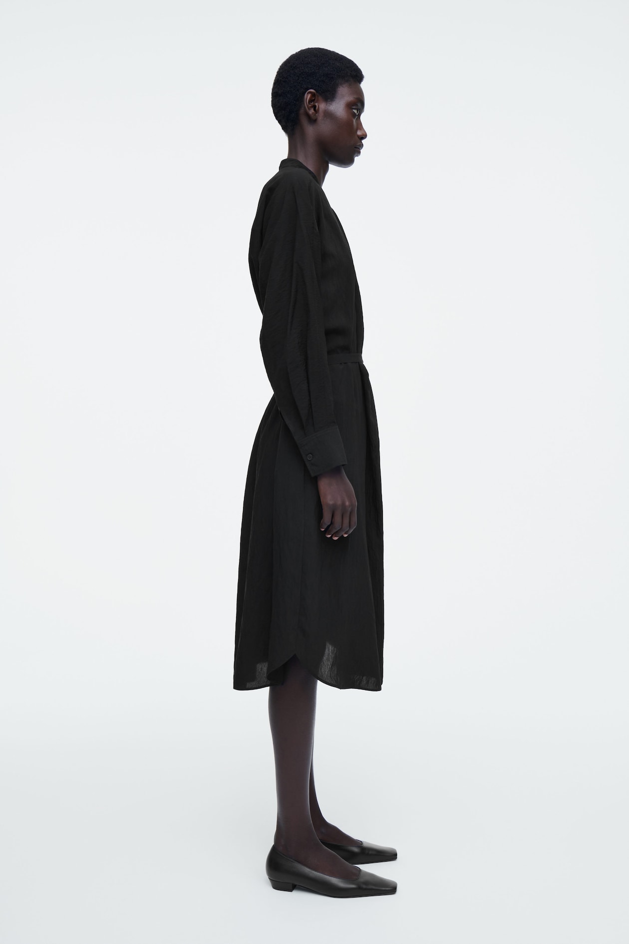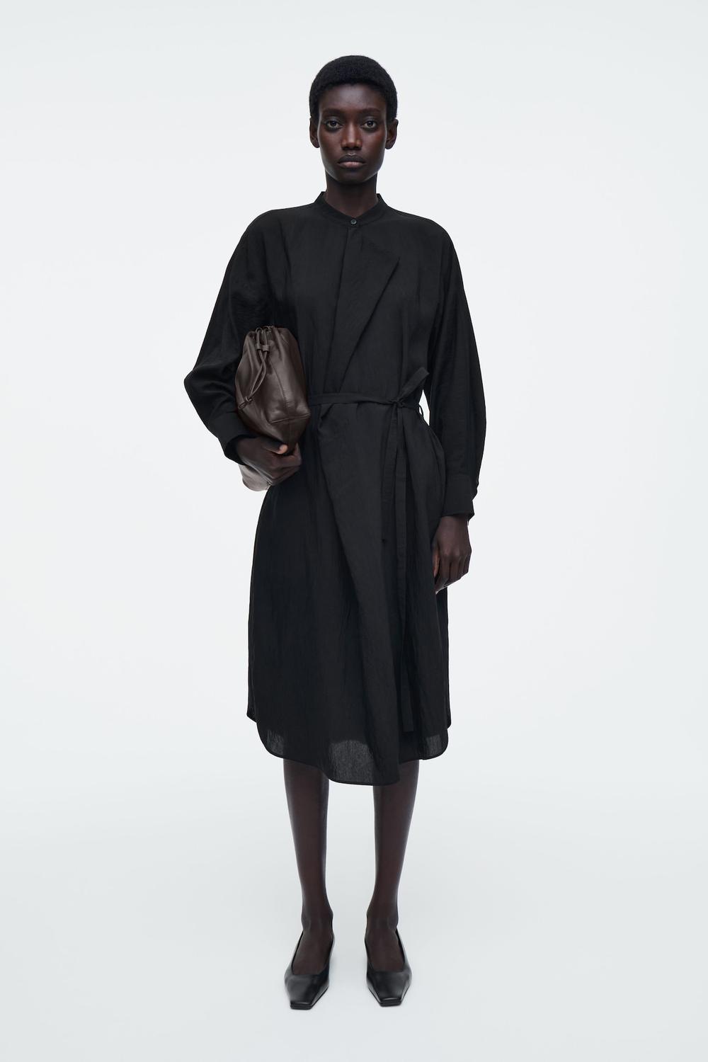 Представляем платье миди из вискозы ECOVERO, волокна которой отличаются легкостью, что придает конструкции текучесть. Модель классического черного цвета отличается драпированными лацканами, изящным воротником-стойкой, застегивающимся на пуговицу, и галстуком, подчеркивающим талию.