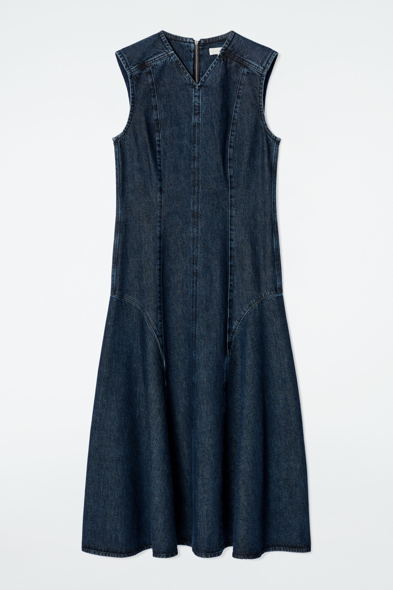 Представляем вам платье-миди без рукавов, вдохновленное тенденциями первого десятилетия XXI века. Модель — характерного синего цвета джинсов — выполнена из органического хлопка. Модель имеет V-образный вырез и слегка закругленные швы, подчеркивающие заниженную линию талии. Мы рекомендуем сочетать платье с сапогами.