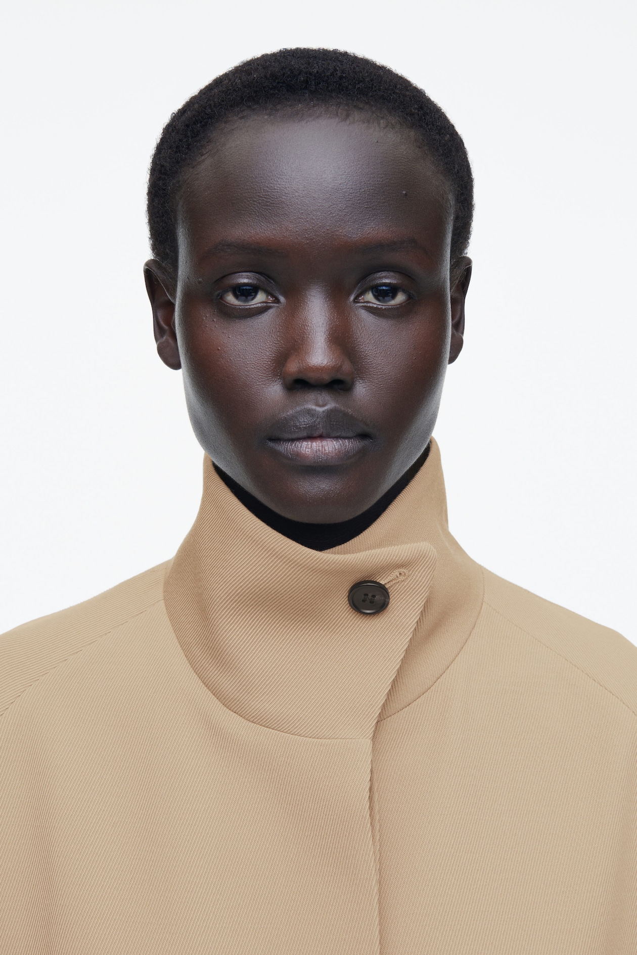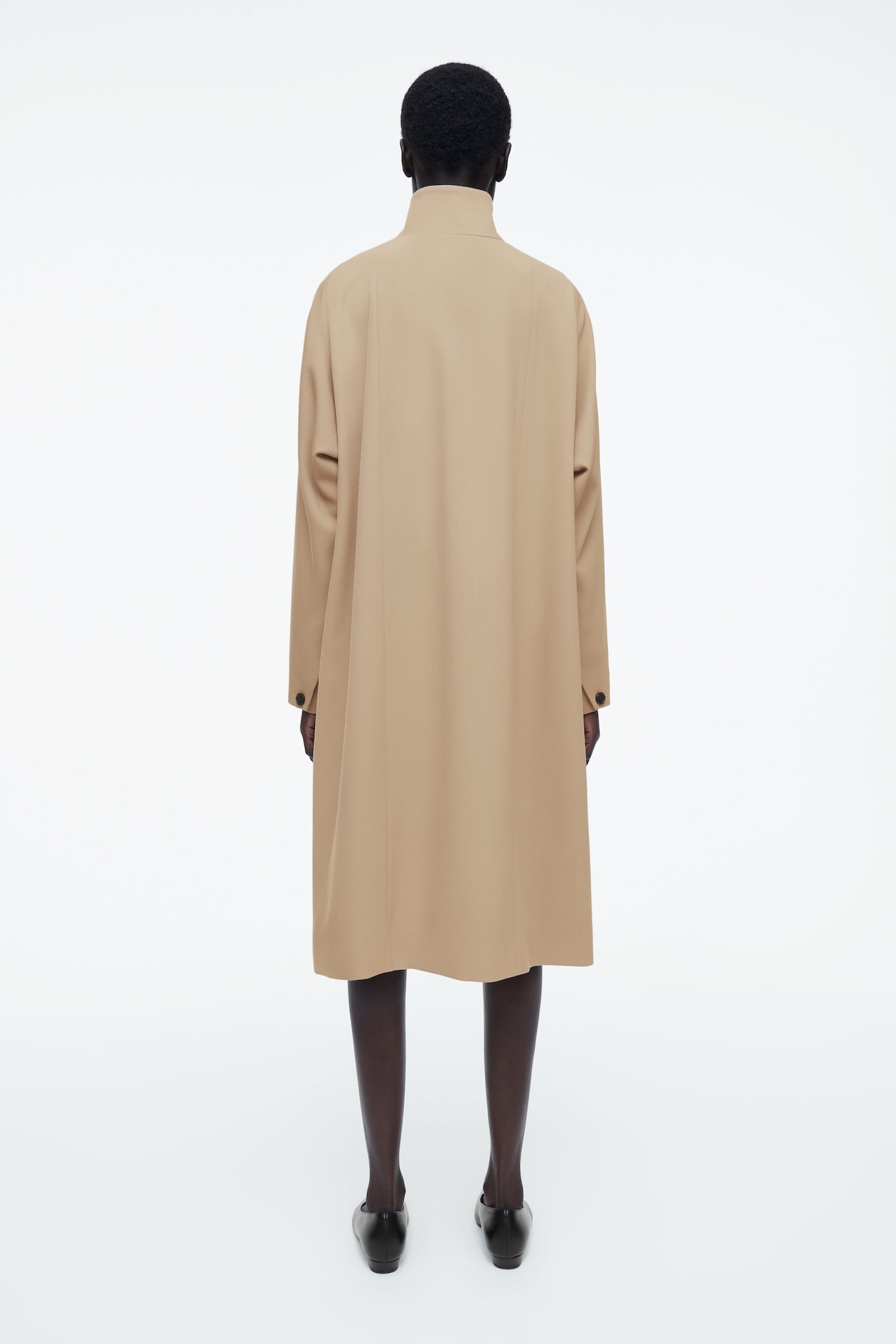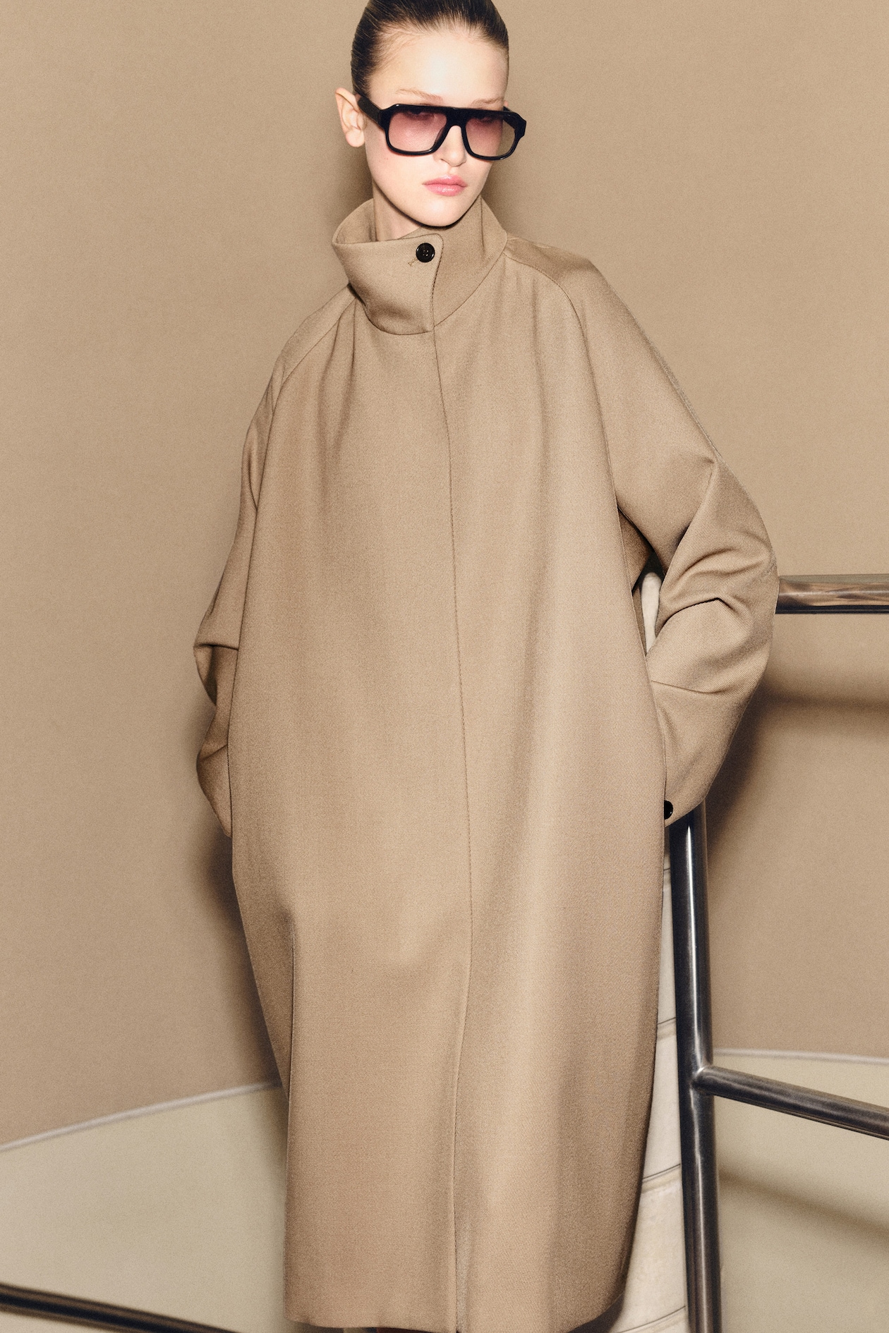 В этом сезоне команда дизайнеров женской одежды представляет новую версию классического длинного пальто. Модель выполнена из смеси, содержащей высококачественную сертифицированную шерсть RWS, в классическом бежево-верблюжьем цвете. Платье имеет трапециевидный крой, слегка объемный низ, слегка закругленный воротник-стойку и рукава «летучая мышь».