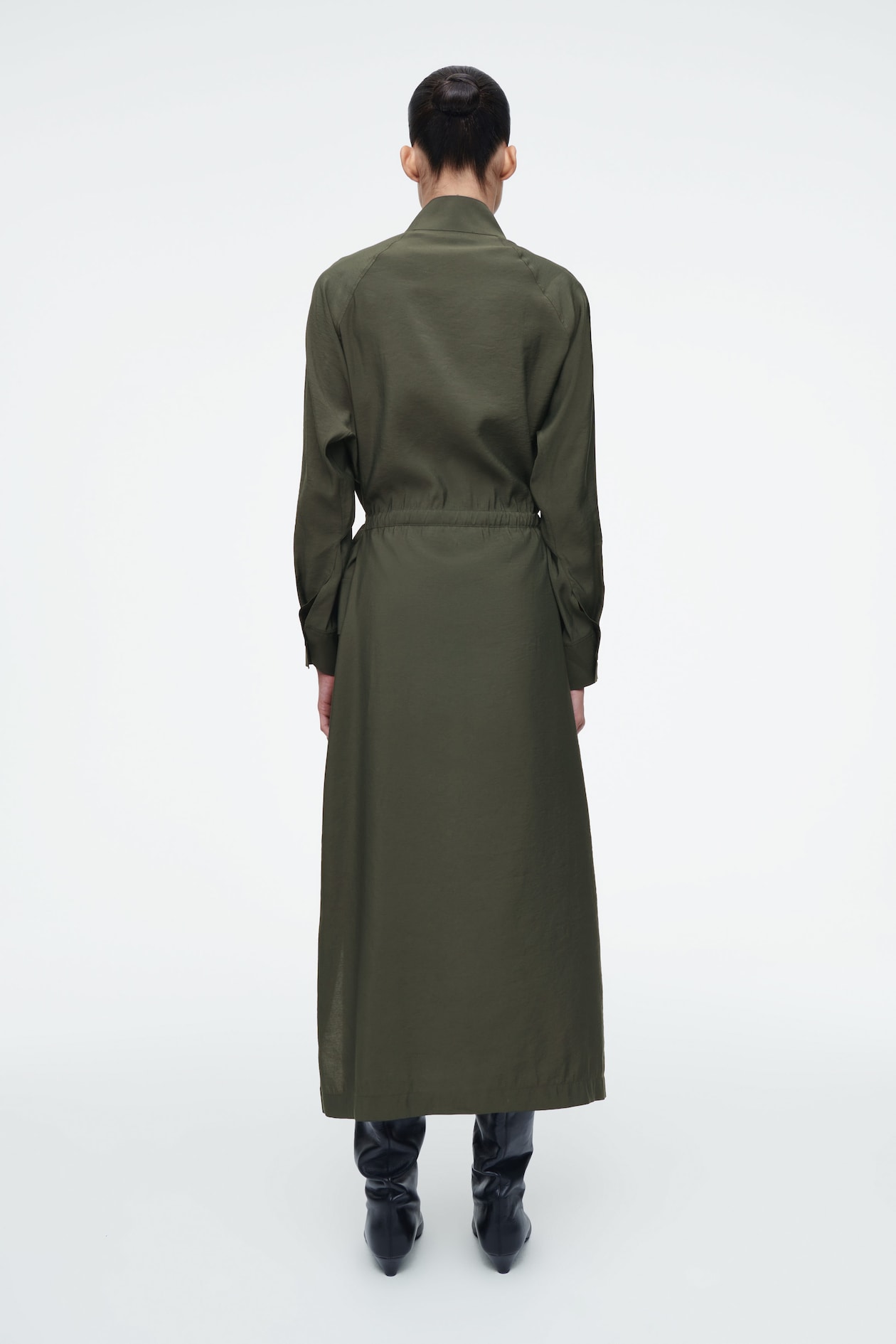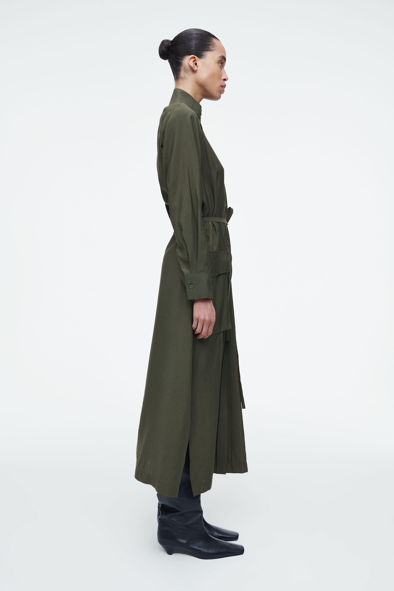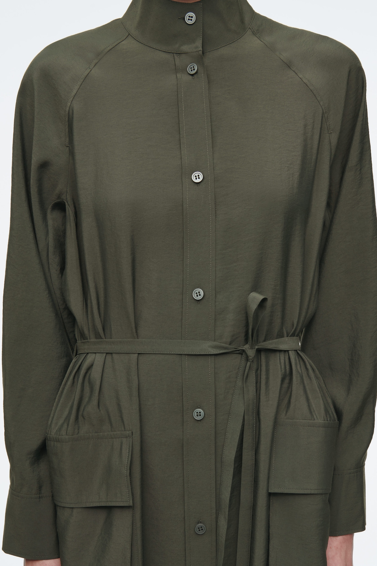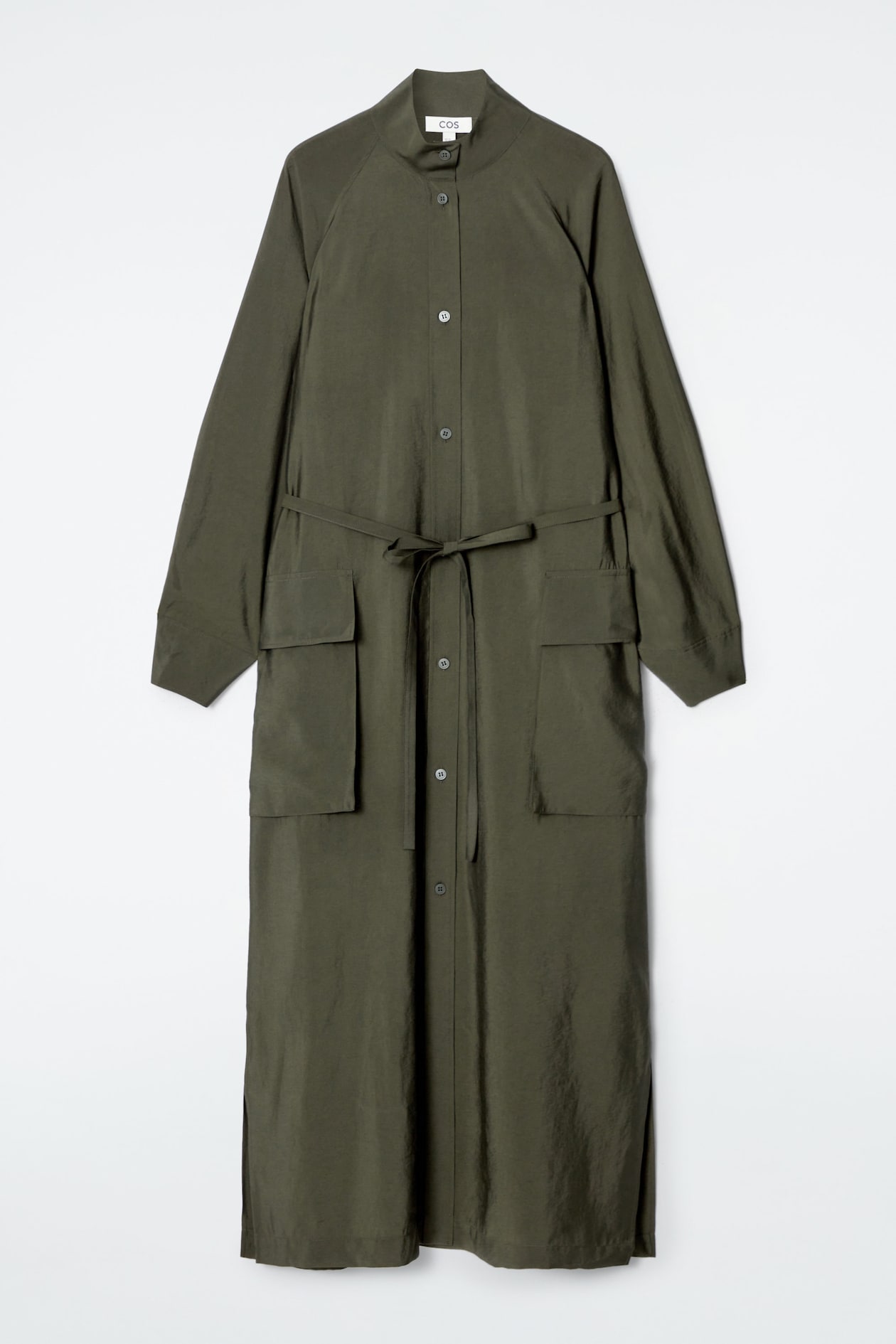 Это современное платье-рубашка вдохновлено практичным стилем. Изготовлен из струящейся смеси, содержащей модал TENCEL, темно-оливкового цвета. Высокий воротник, рукава реглан и большие карманы с клапанами по бокам. Пояс в тон подчеркивает силуэт, несмотря на повседневный стиль.