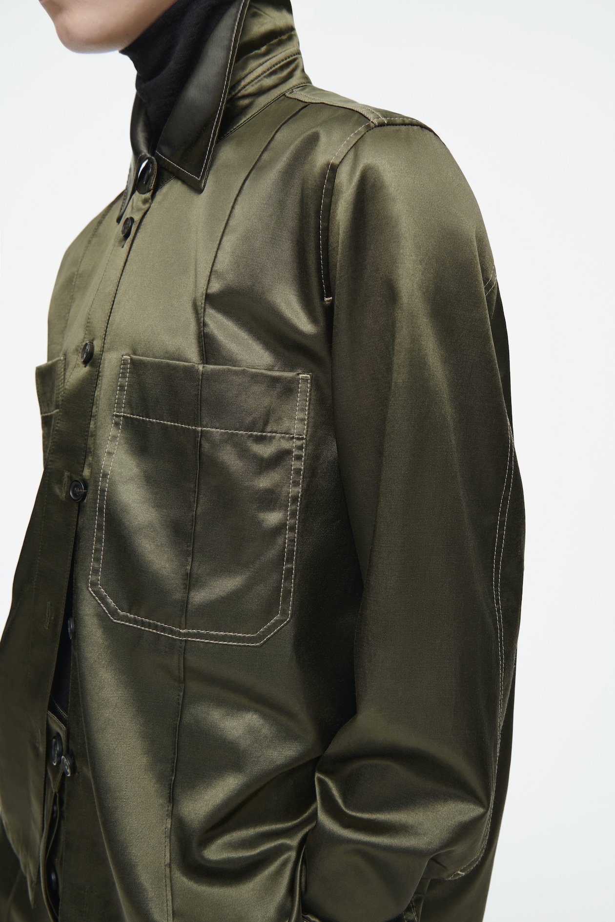 В этом сезоне мы сочетаем практичный стиль с изысканными материалами. Эта рубашка цвета хаки выполнена из хлопкового атласа с легким блеском. Имеет накладные карманы, отстрочку и манжеты на пуговицах. Носите его с подходящими брюками для вечеринок.