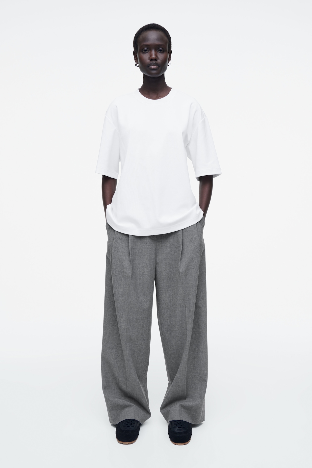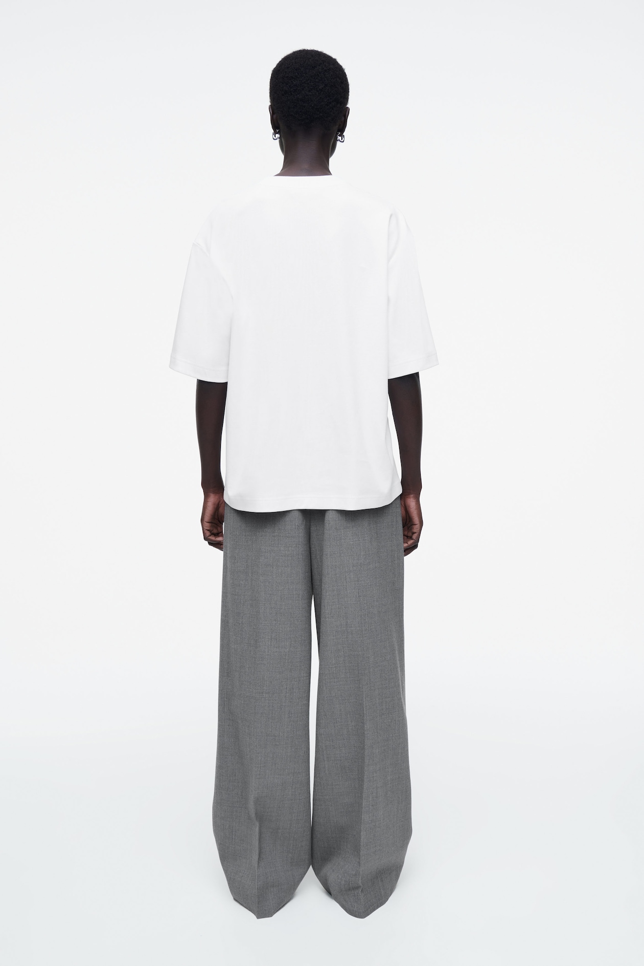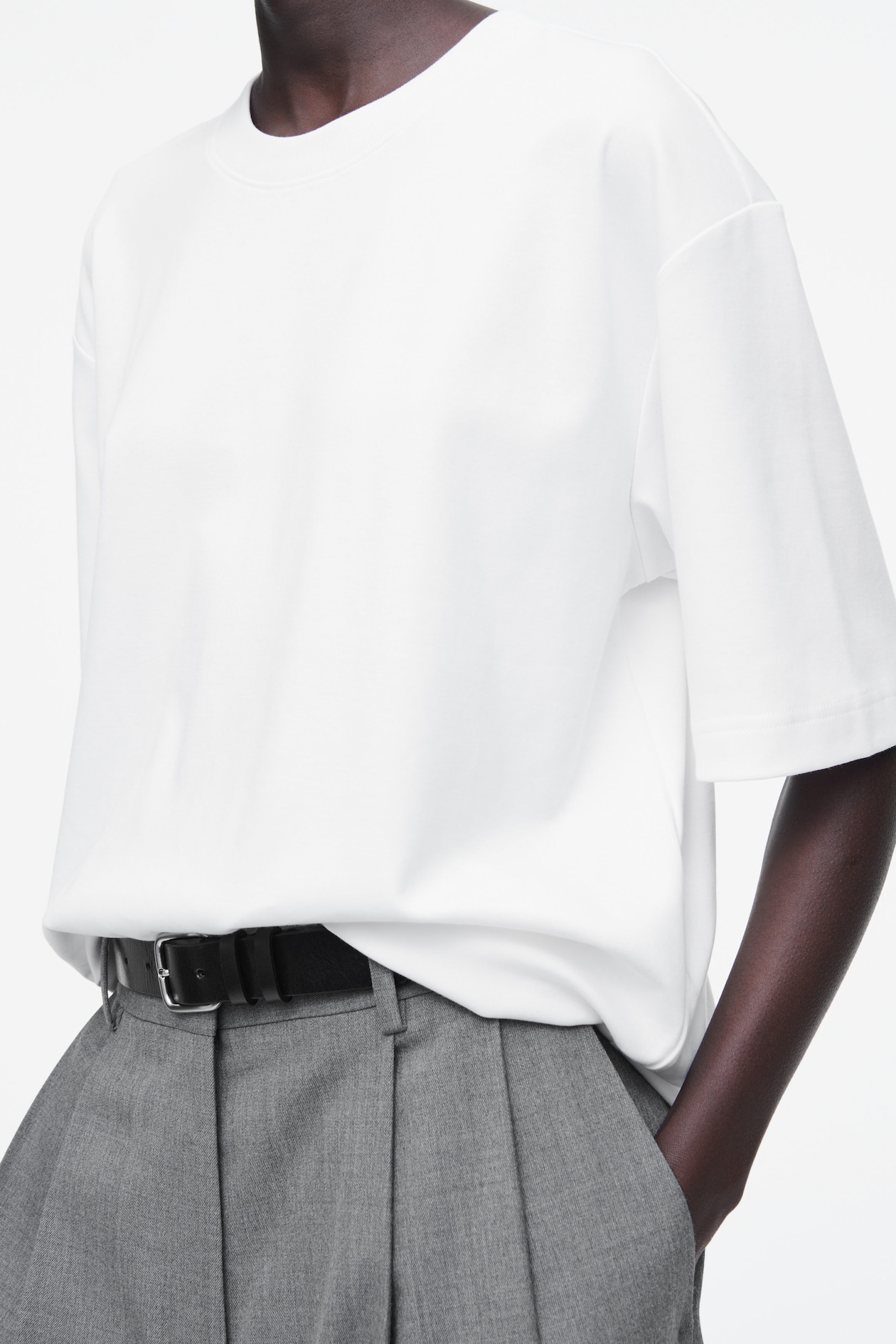 Крой oversize уже давно стал одной из отличительных черт коллекций COS. Эта белая футболка свободного кроя изготовлена из мягкого трикотажа из органического хлопка. Модель имеет ребристую отделку на круглом вырезе, длинные короткие рукава и широкий подол для свободного кроя. Надевайте поверх трикотажных изделий, чтобы создать многослойные образы.