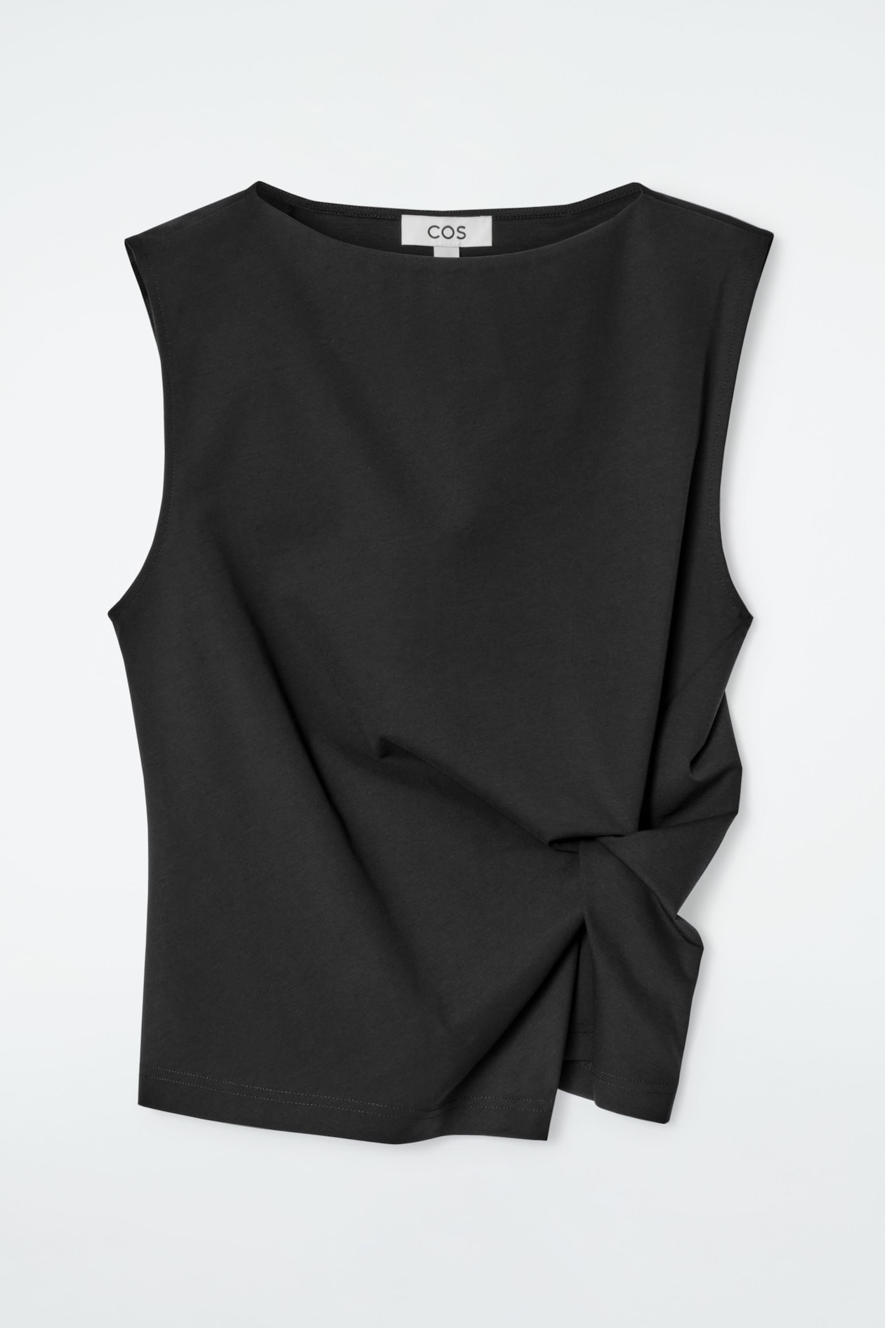 Представляем блузку без рукавов с декоративной сборкой, которая тонко подчеркивает талию. Черная модель выполнена из смеси хлопка пима и дополнена высоким вырезом горловины. Мы рекомендуем дополнить образ джинсами или создать монохромный комплект с подходящей юбкой.