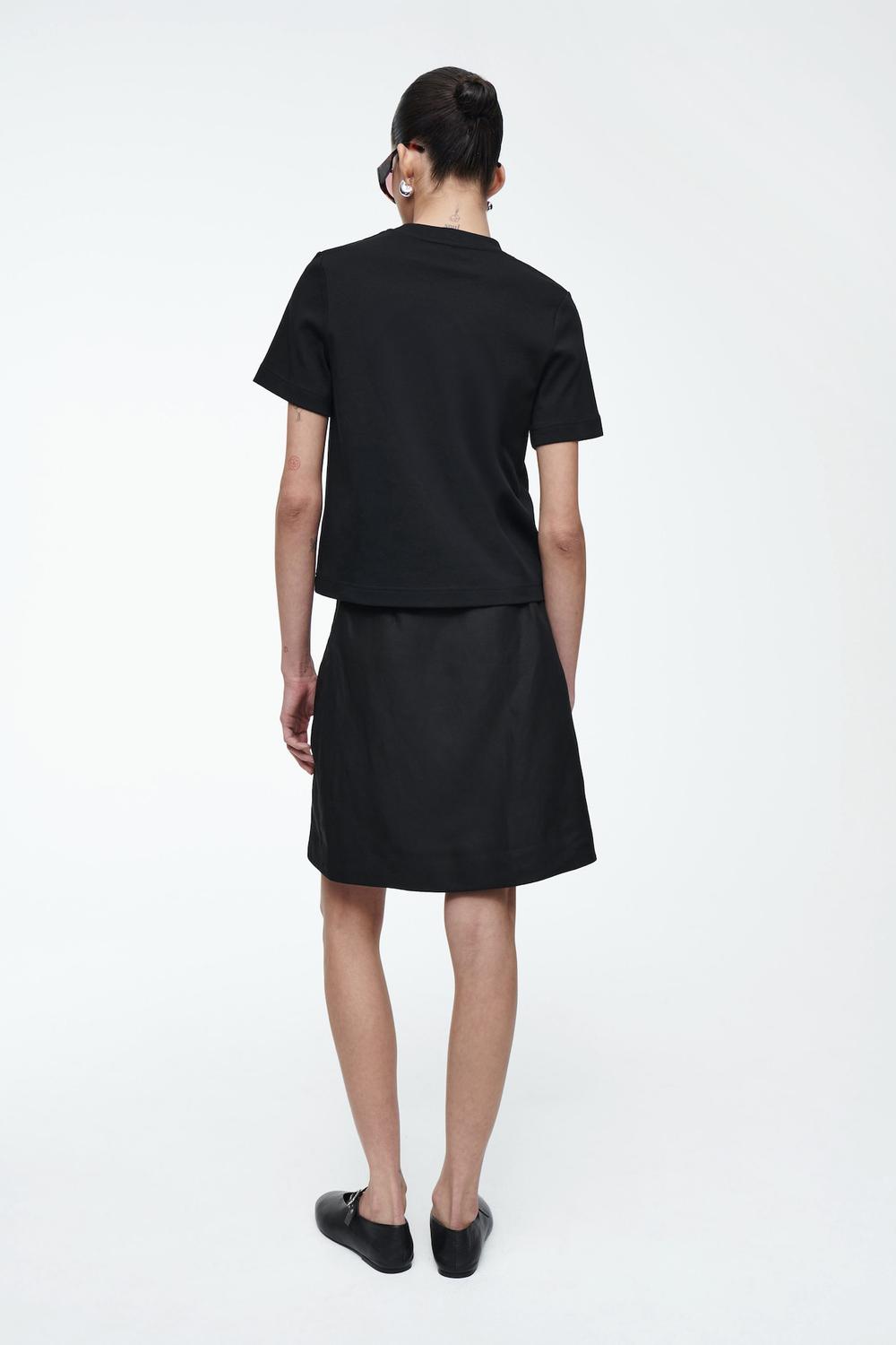 Эта мини-юбка имеет простой, но стильный дизайн, который легко найдет свое место в любом современном гардеробе. Платье выполнено в классическом черном цвете, имеет трапециевидный крой, складку спереди и разрез внизу, что обеспечивает полную свободу движений. Изготовлен из легкой и воздушной смеси лиоцелла TENCEL и льна.