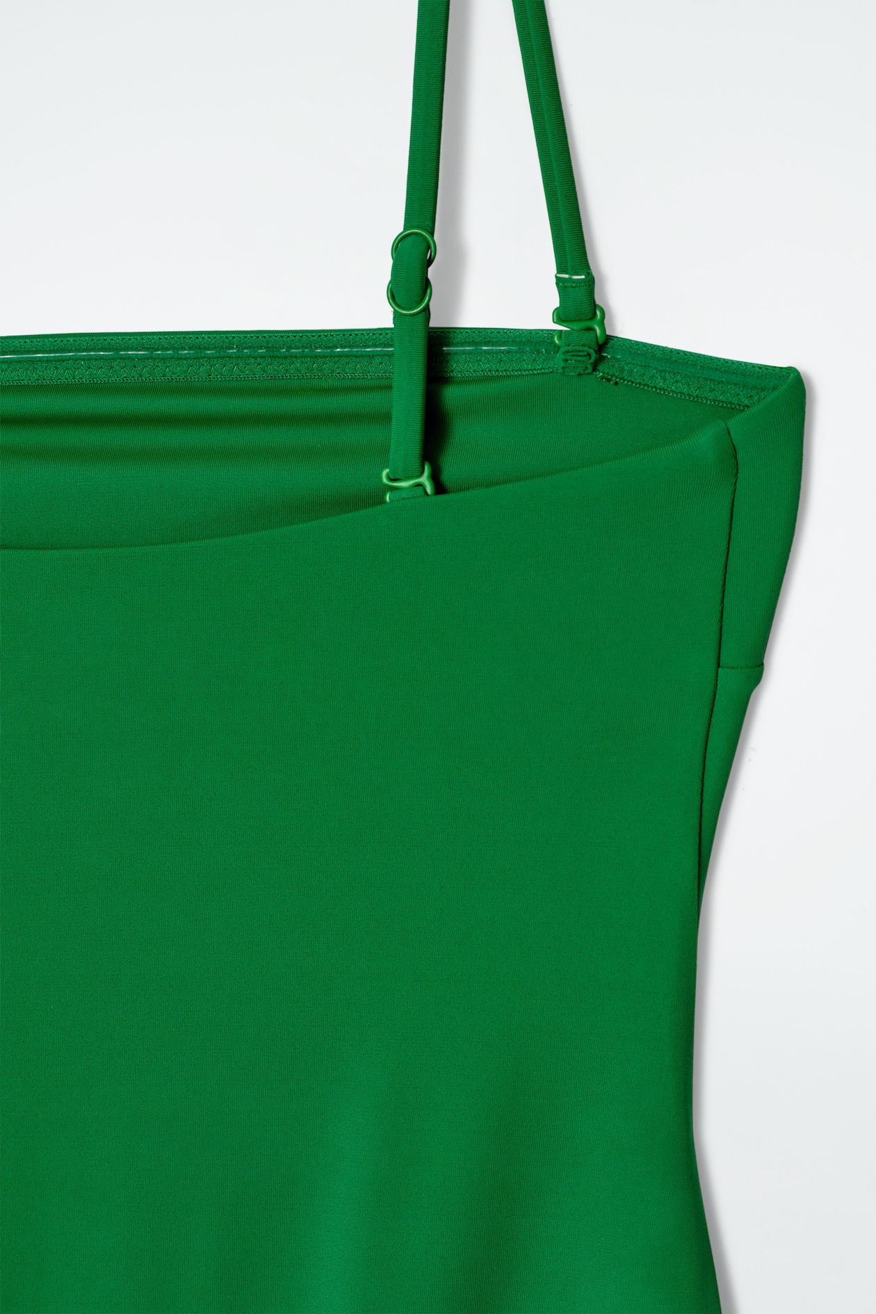 Представляем вам слитный купальник, который отлично впишется в пляжный образ. Модель сочного зеленого оттенка оснащена съемными бретелями и вытачками, корректирующими фигуру.