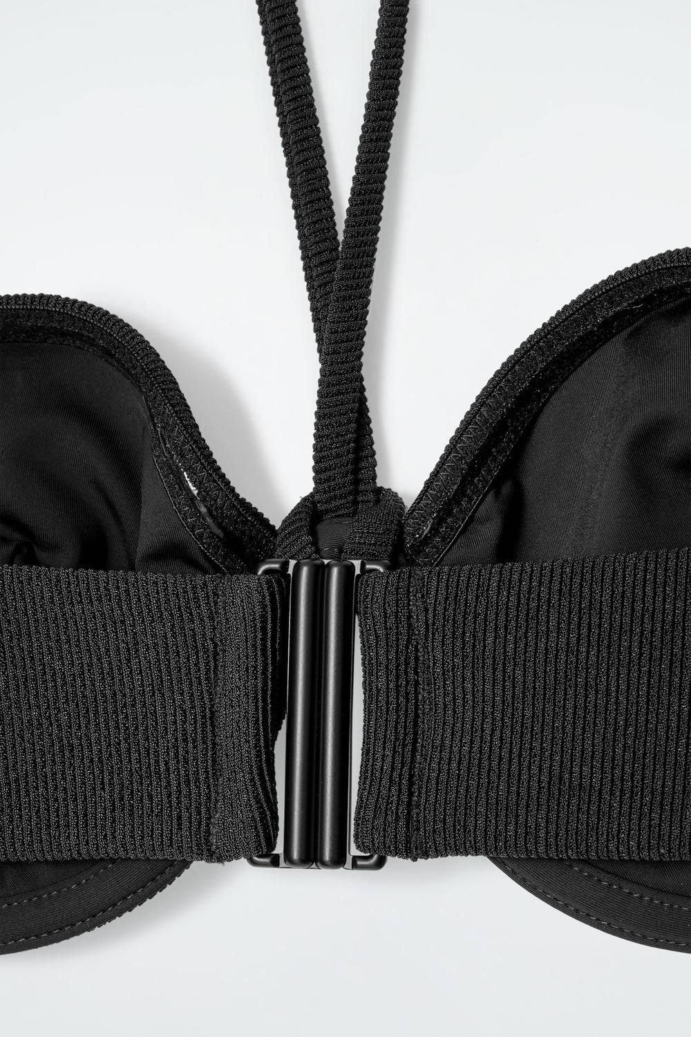 В основе коллекции купальников COS лежат тщательно продуманные до мельчайших деталей дизайны. Представляем вашему вниманию ребристый верх бикини с тонкими завязывающимися бретелями. Завершением образа служат жесткие чашки на косточках. Мы рекомендуем создать раздельный купальник с