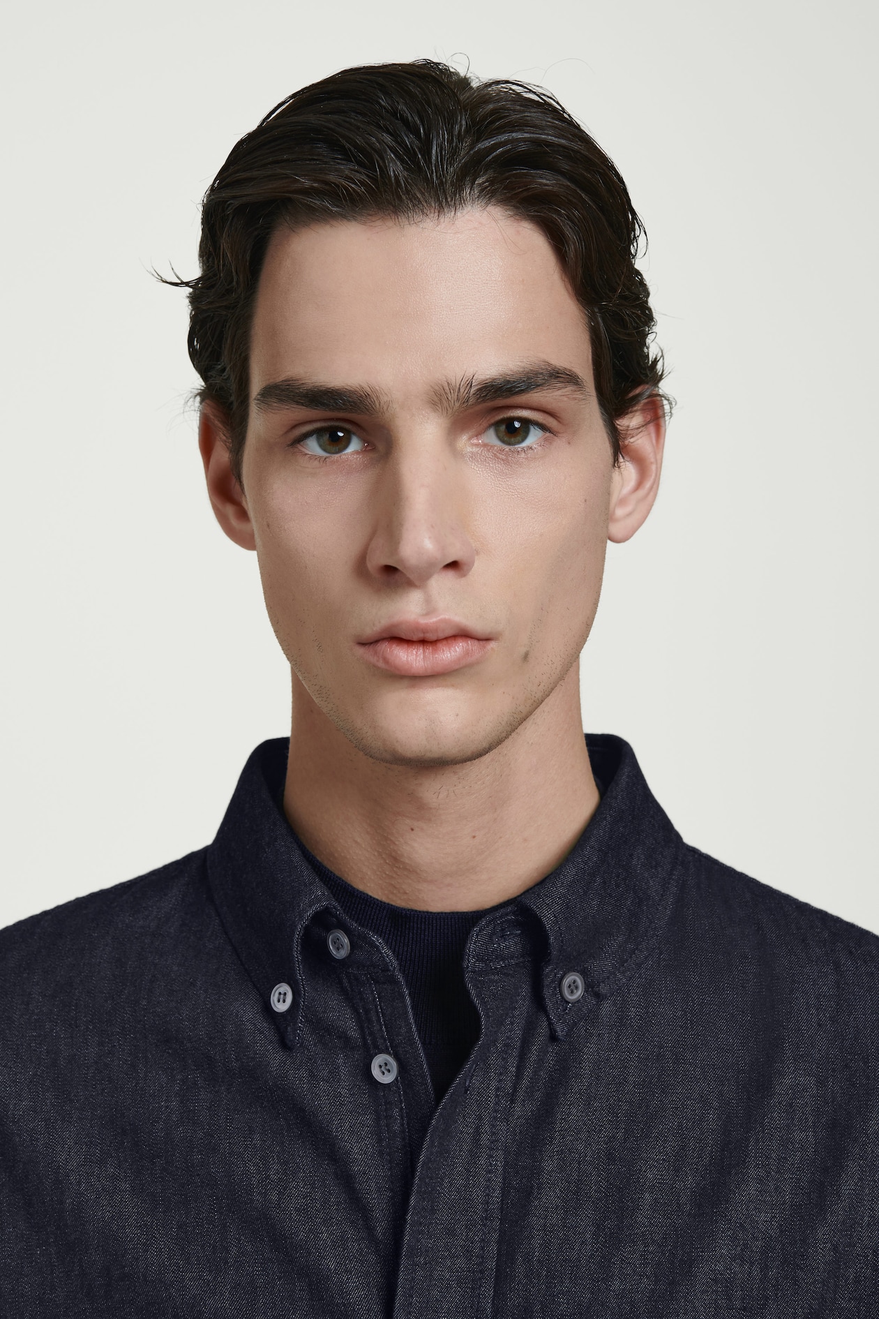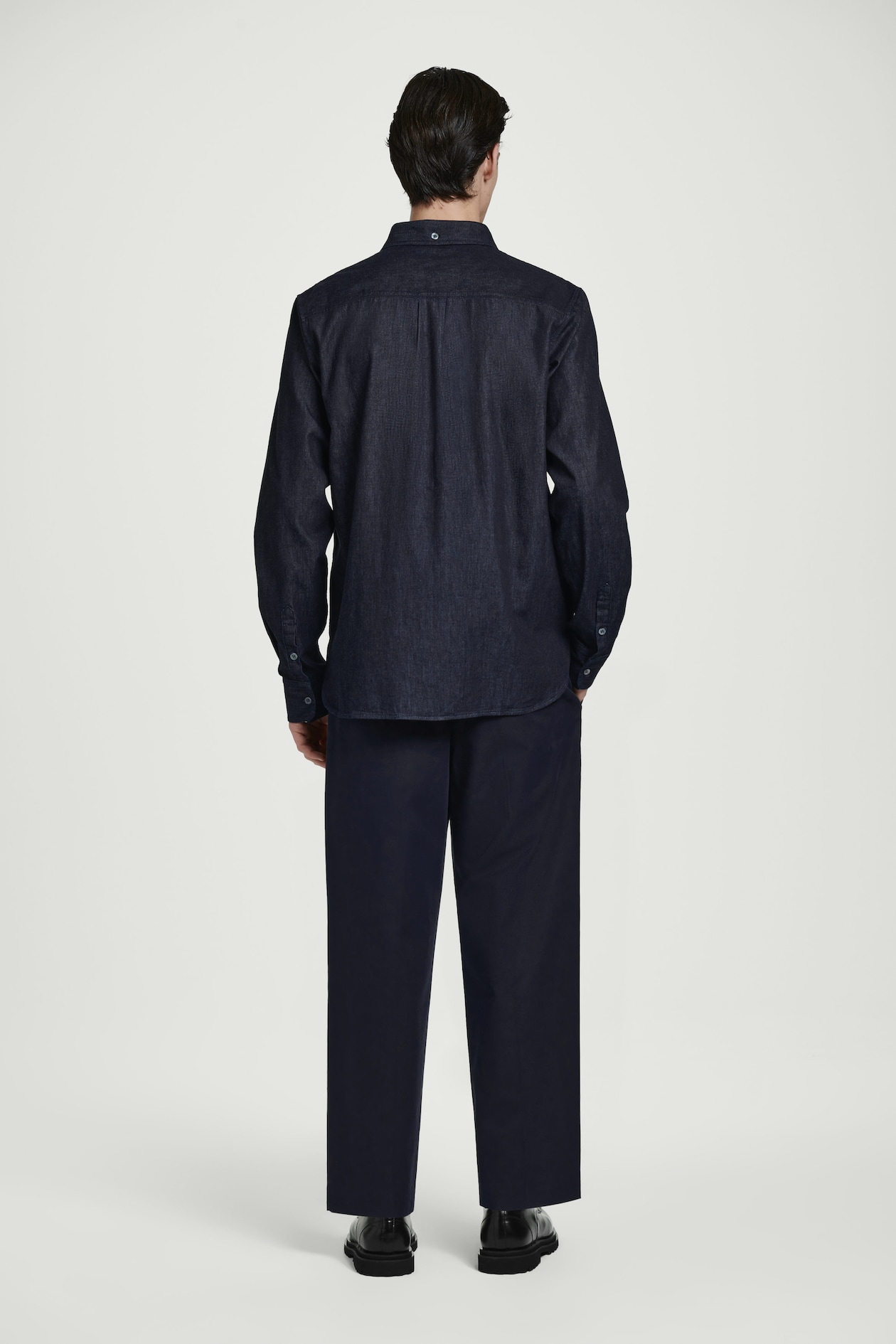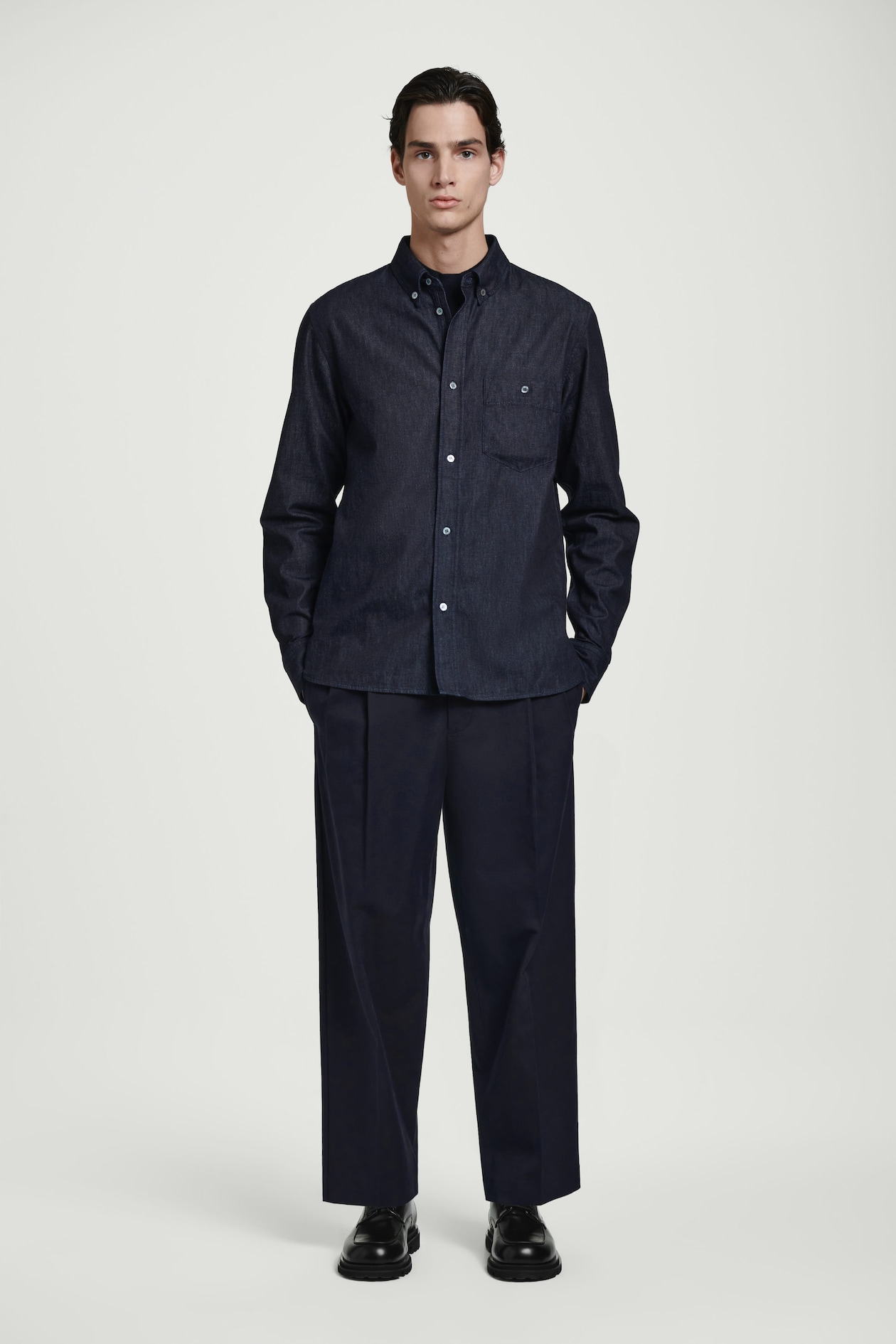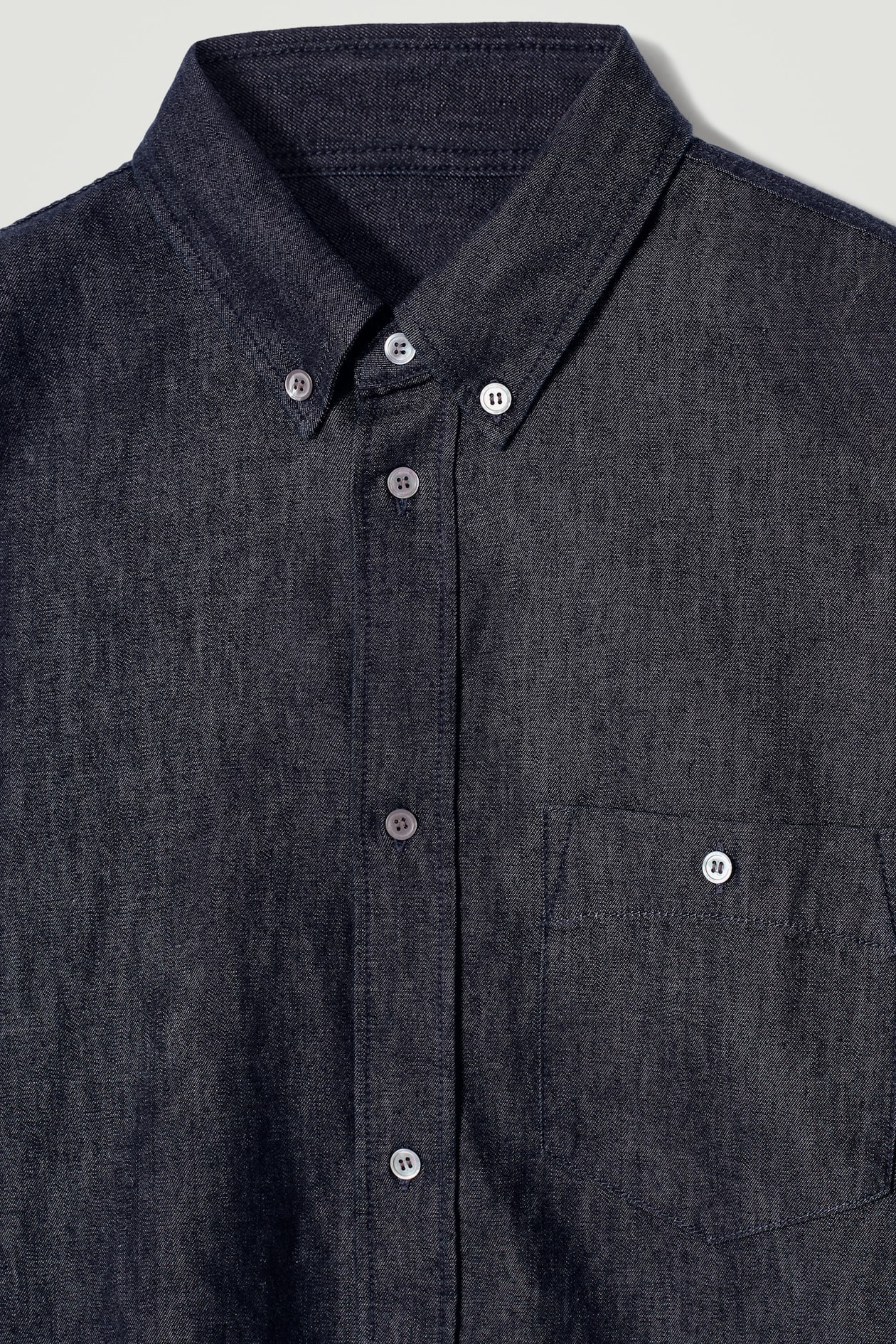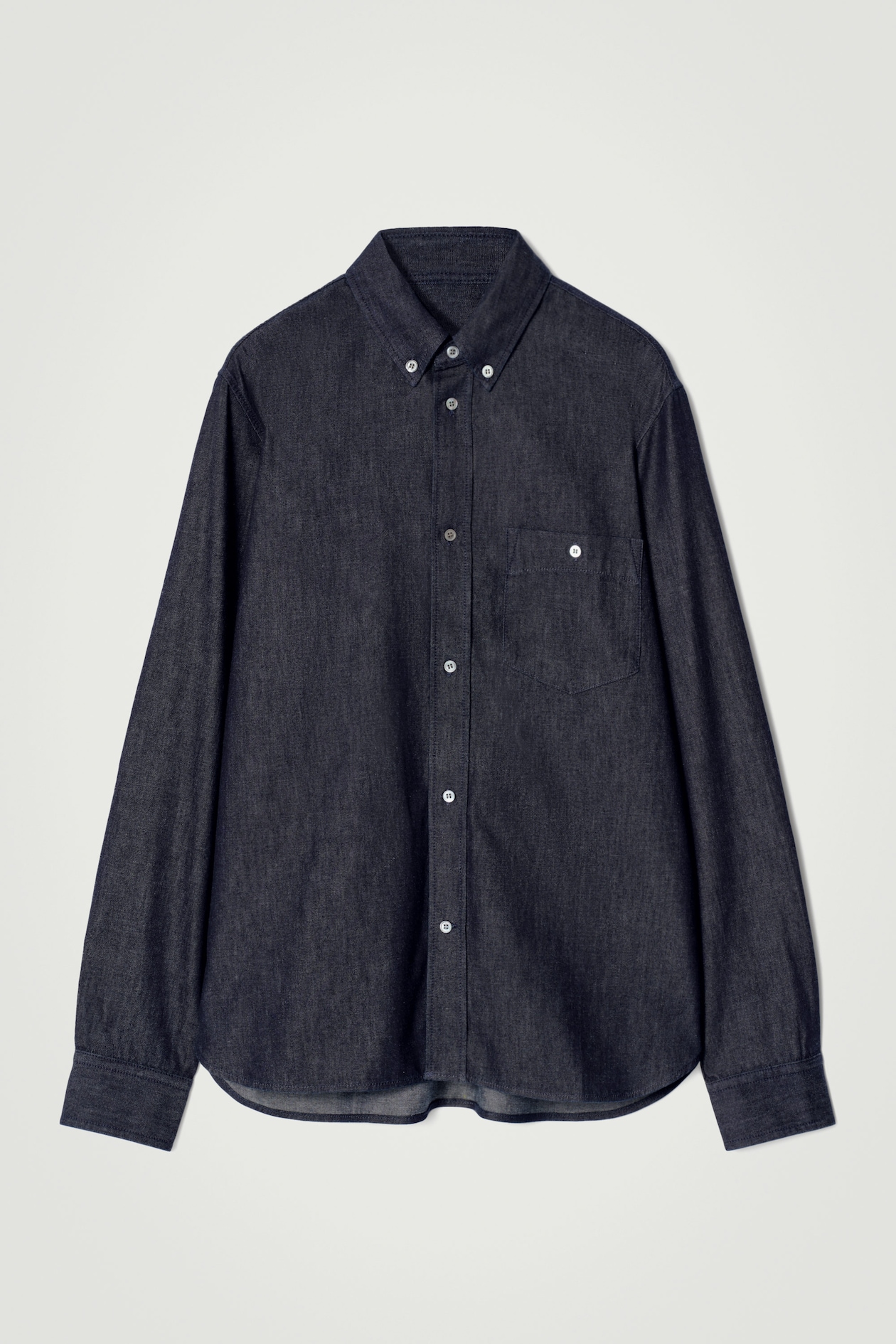 Представляем классическую рубашку оттенка индиго, выполненную из мягкого хлопкового батиста, имитирующего джинс. Характерные элементы дизайна: воротник на пуговицах, накладной карман на груди и перламутровые пуговицы.